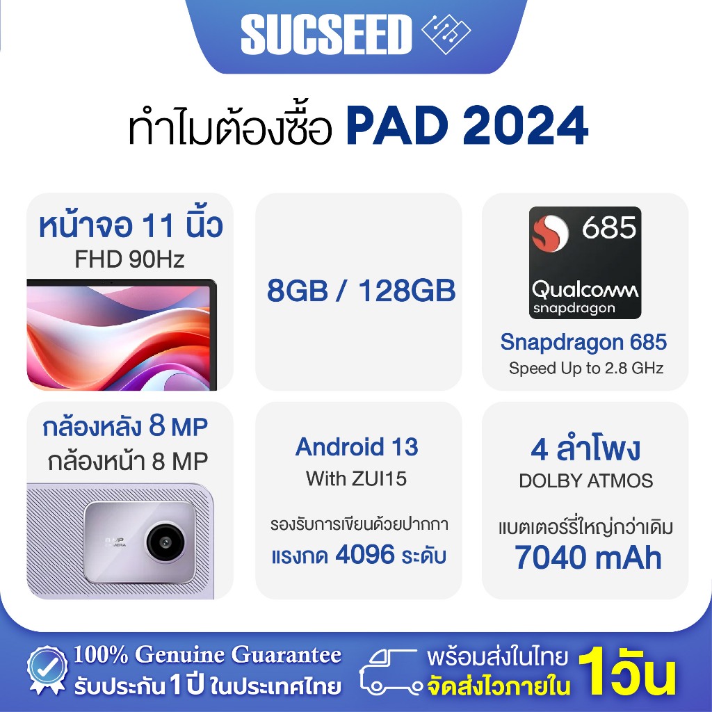 (แถมเคส) Tablet Lenovo Xiaoxin Pad 2024 11 นิ้ว 8/128GB Play Store ภาษาไทย ใส่ซิมไม่ได้ รับประกัน 1 ปีในไทย