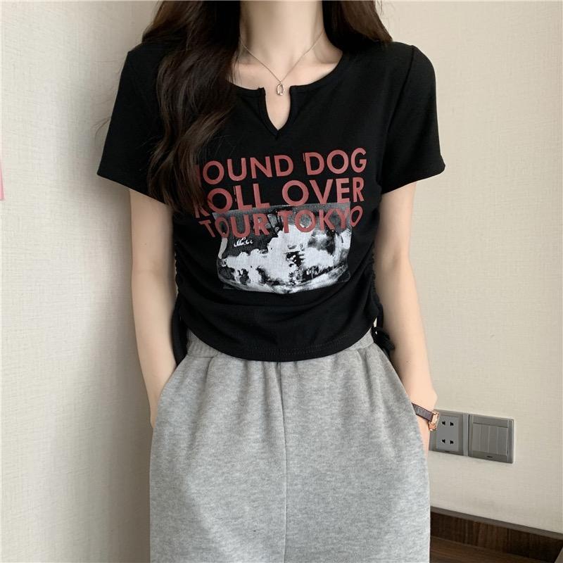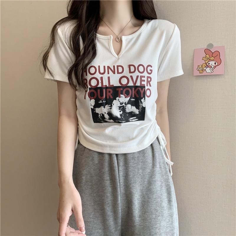 (พร้อมส่ง/ใหม่)#M5501เสื้อยืดคอกลมเชือกผูกแขนสั้นผู้หญิงฤดูร้อนปี 2022 การออกแบบใหม่