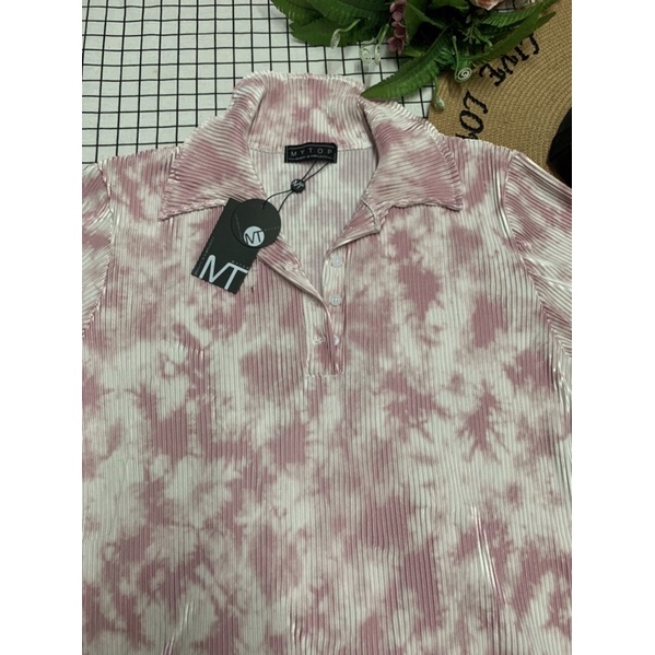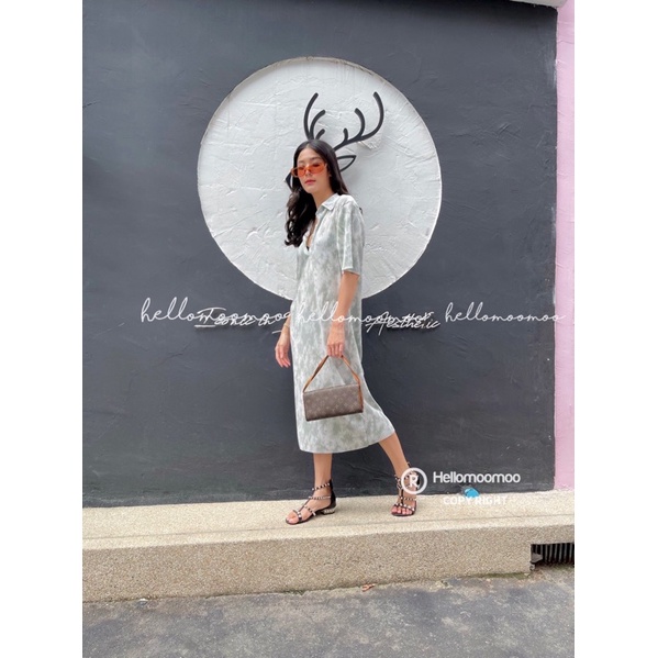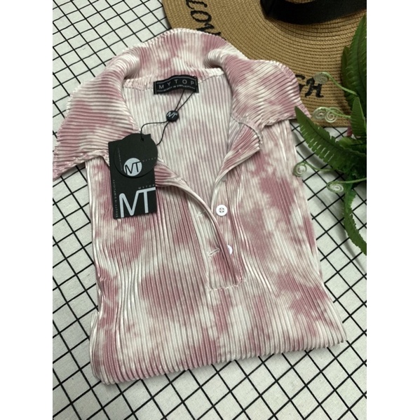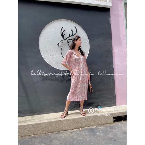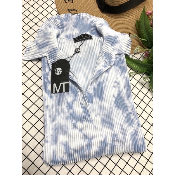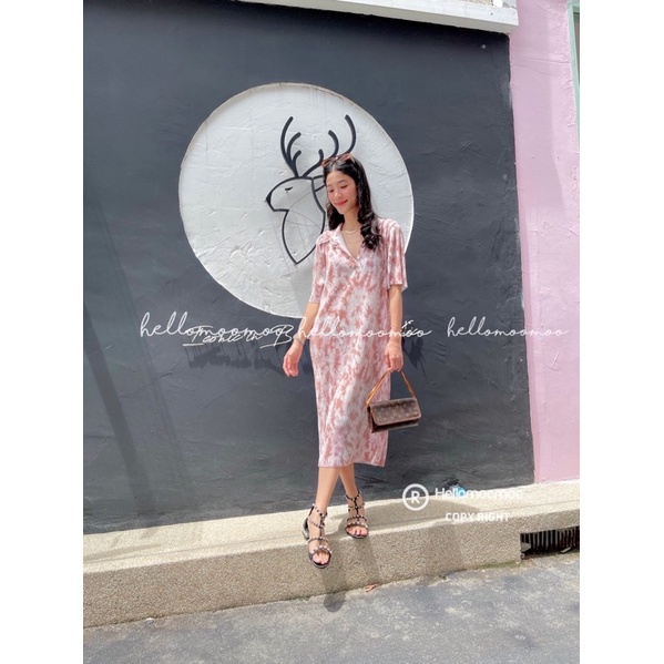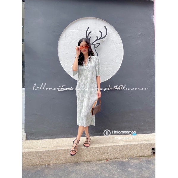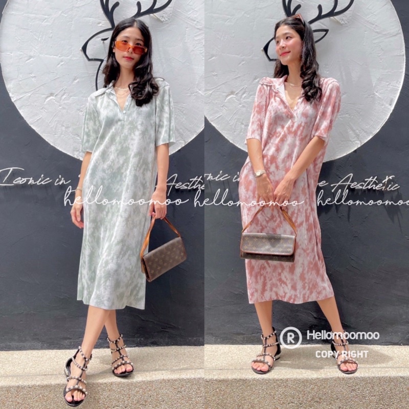 เดรสยาว🏖เดรสพลีทเดรสอัดพลีทลายมัดย้อมดีเทลคอปกแต่งกระดุม