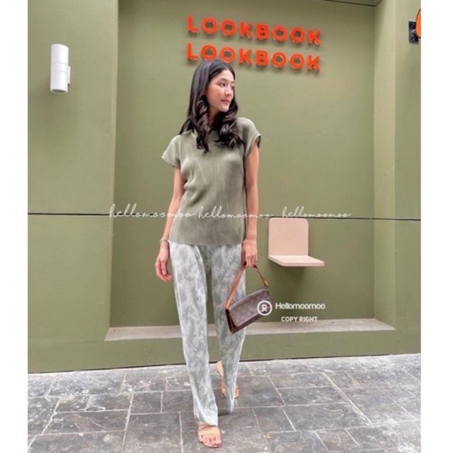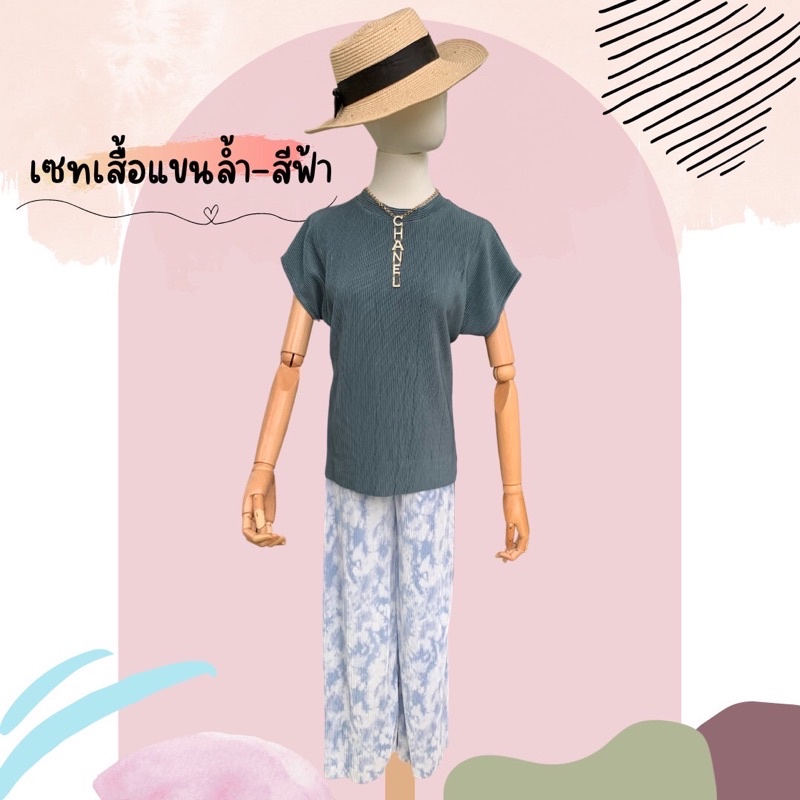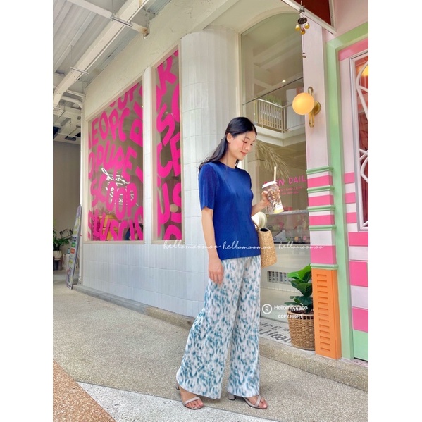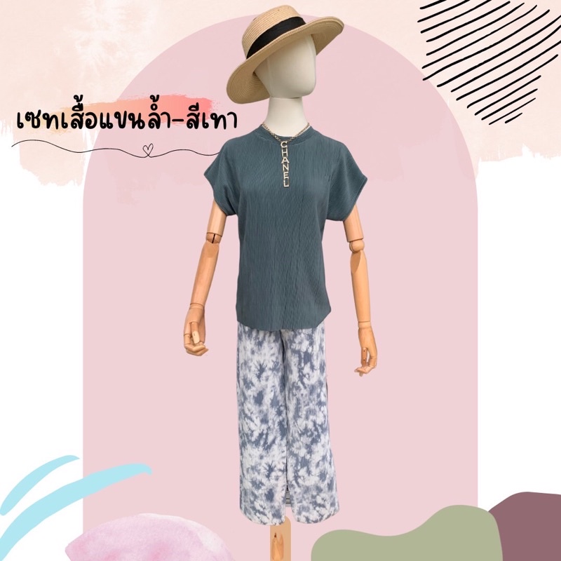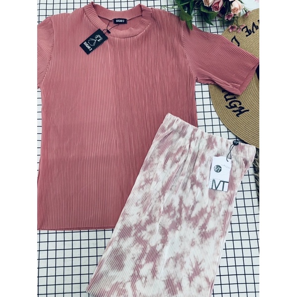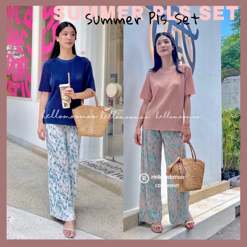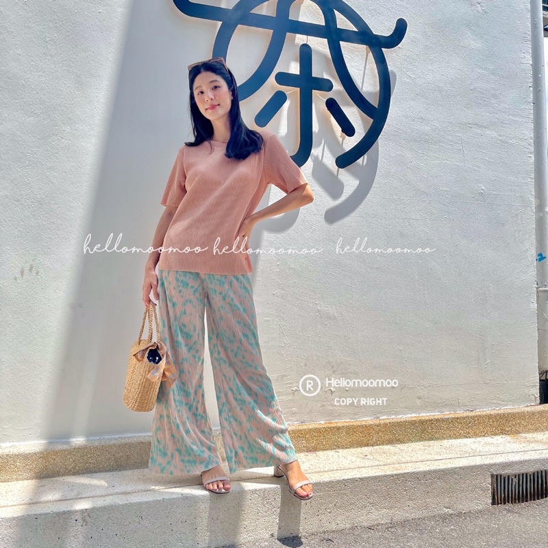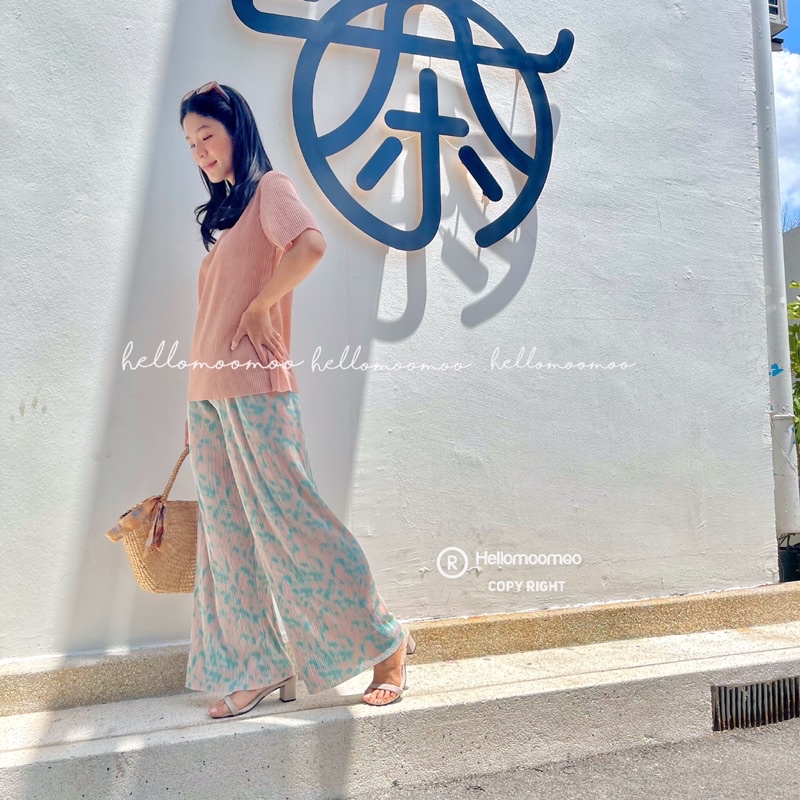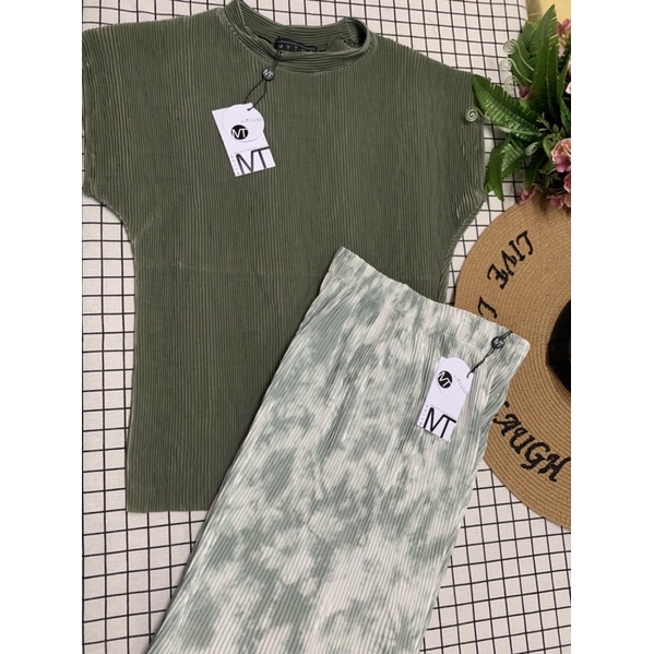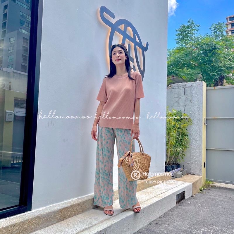 ชุดเซ็ท🏝ชุดเซต2ชิ้นผ้าพลีทเสื้อพื้นคอกลม+กางเกงขายาวพิมพ์ลาย