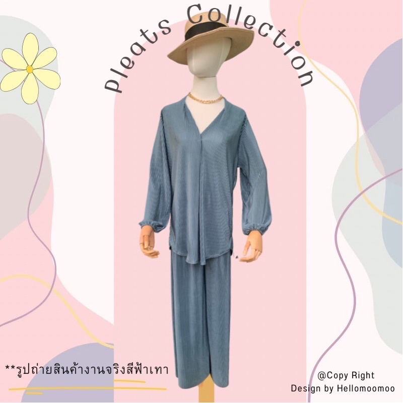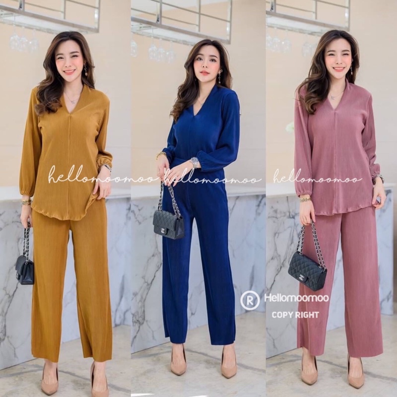 ชุดเซ็ท2ชิ้น🏝ผ้าพลีทเสื้อคอวีหรือคอผ่าแขนยาว+กางเกงขากระบอก