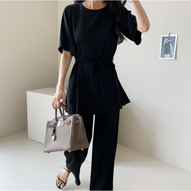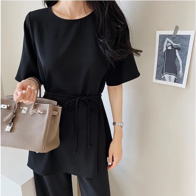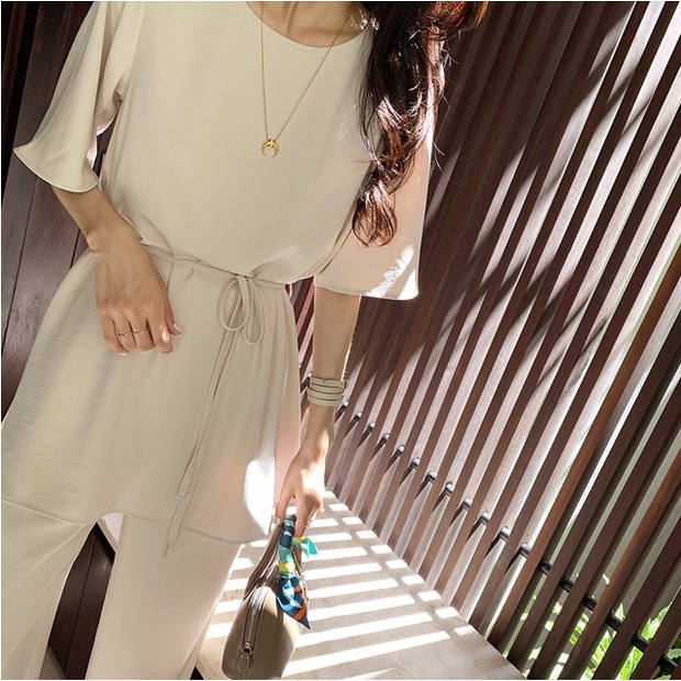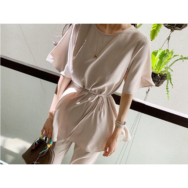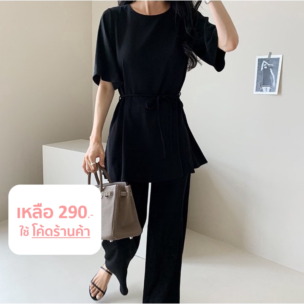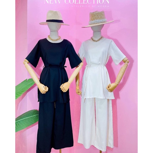 StyleRich ชุดเซต เสื้อแขนสั้นกางเกงขาม้าเล็ก ผ้าฝ้ายผสมลินิน Free size สี ครีม/ดำ