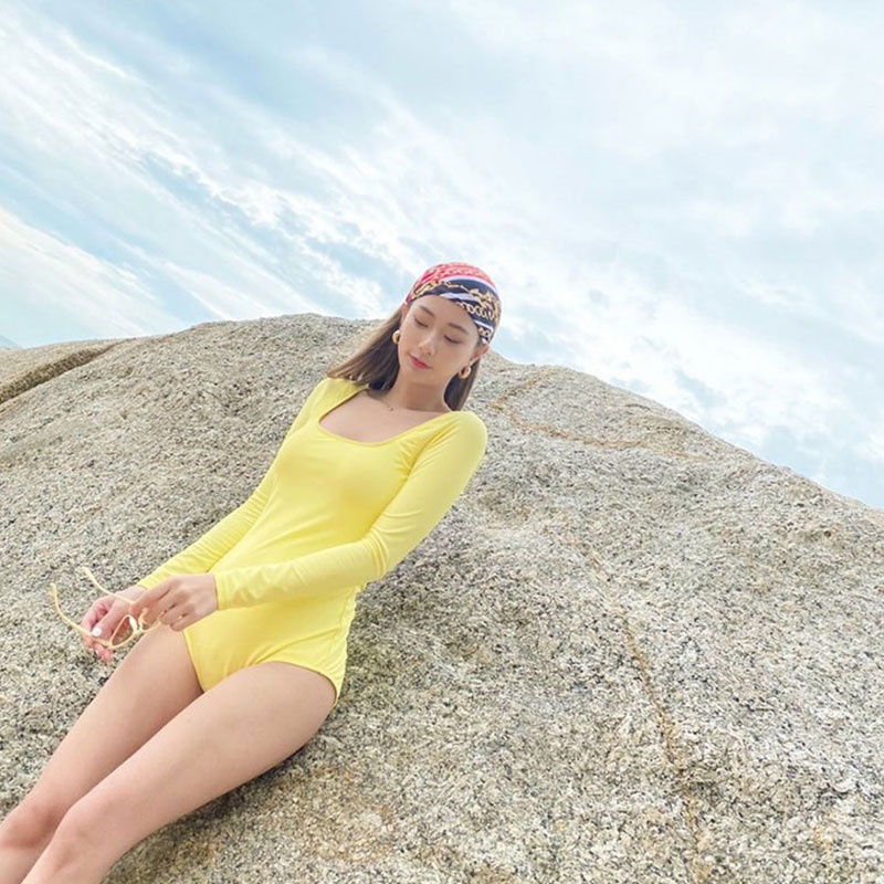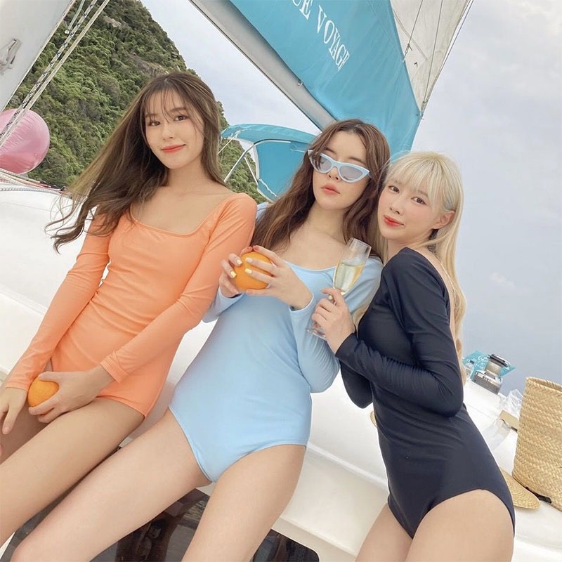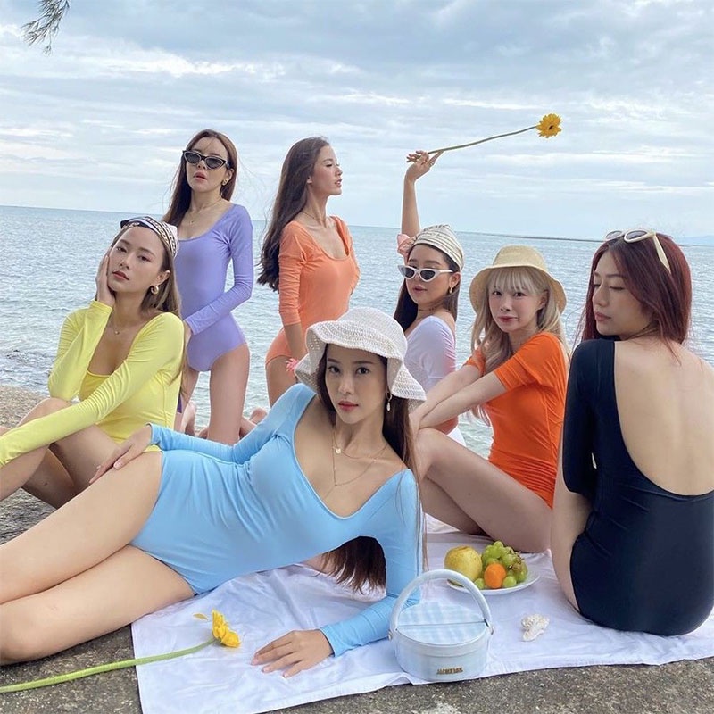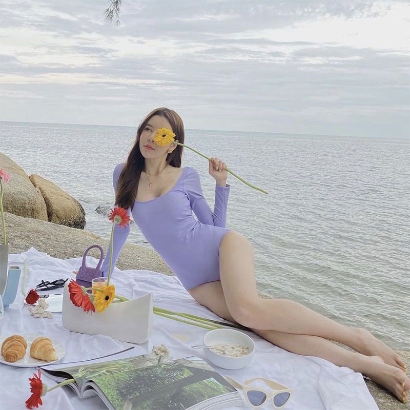 ชุดว่ายน้ำแฟชั่นผู้หญิง ชุดวันพีชสีพาทเทล ชุดว่ายน้ำสไตล์เกาหลีแขนยาวเว้าหลัง เลือกสีได้