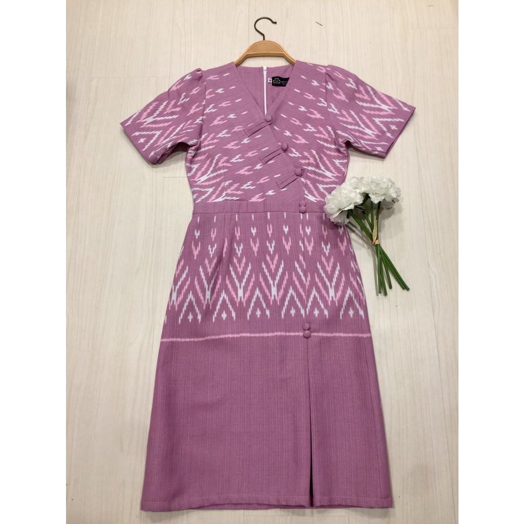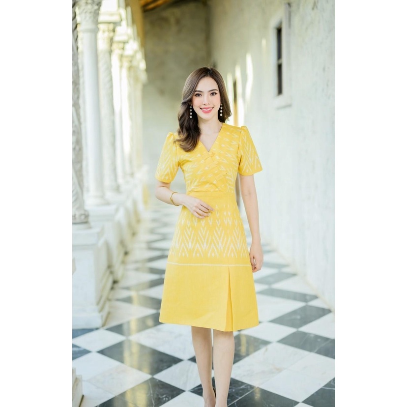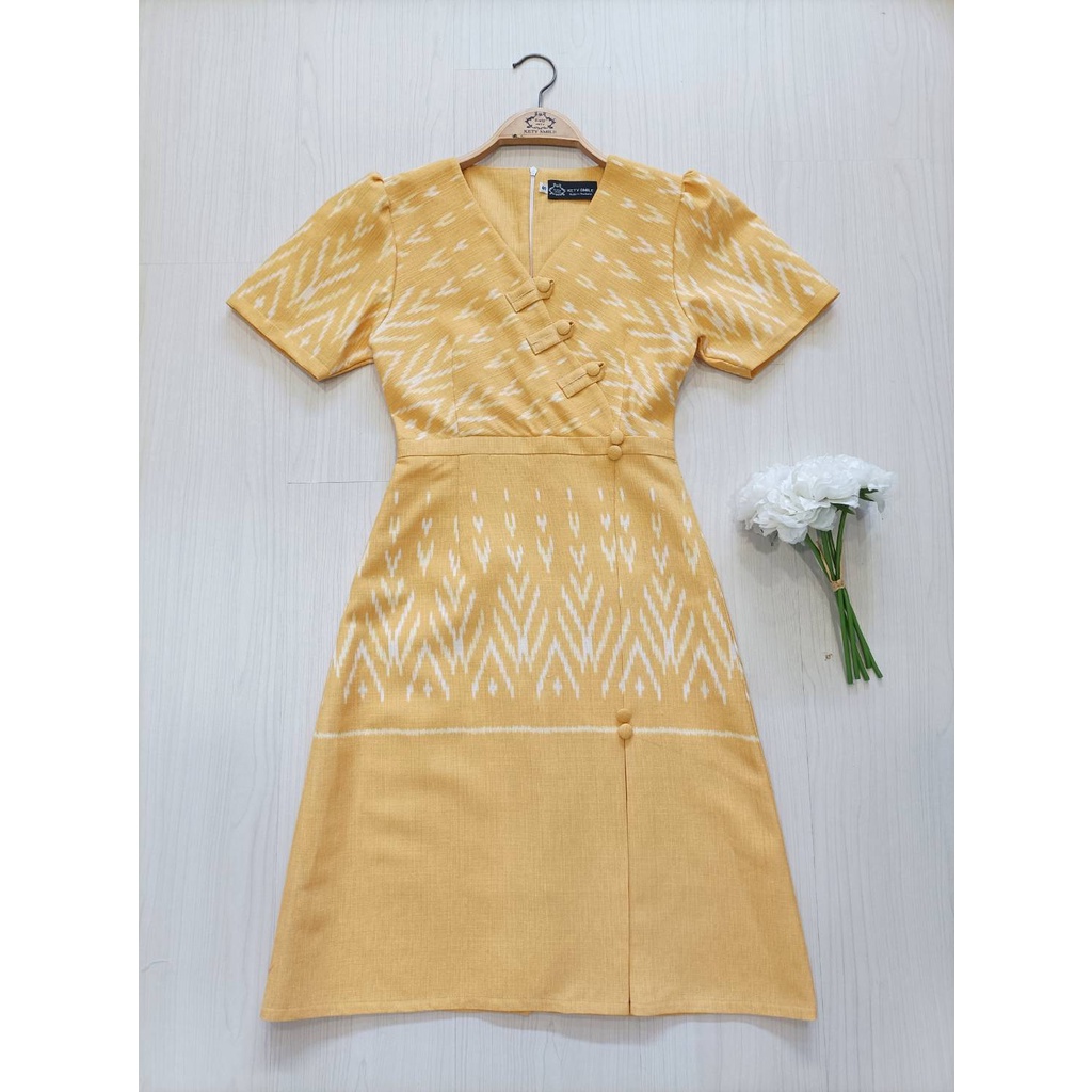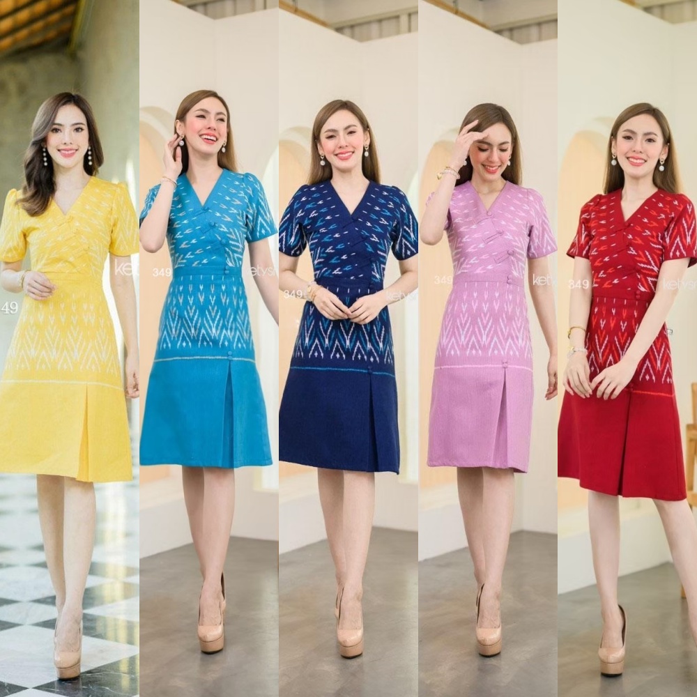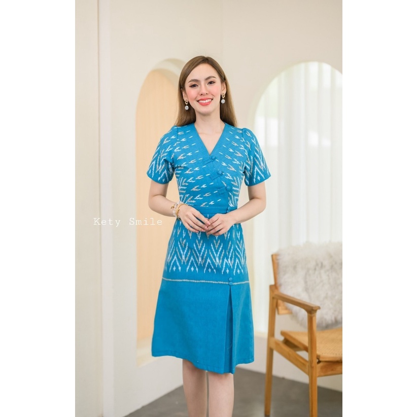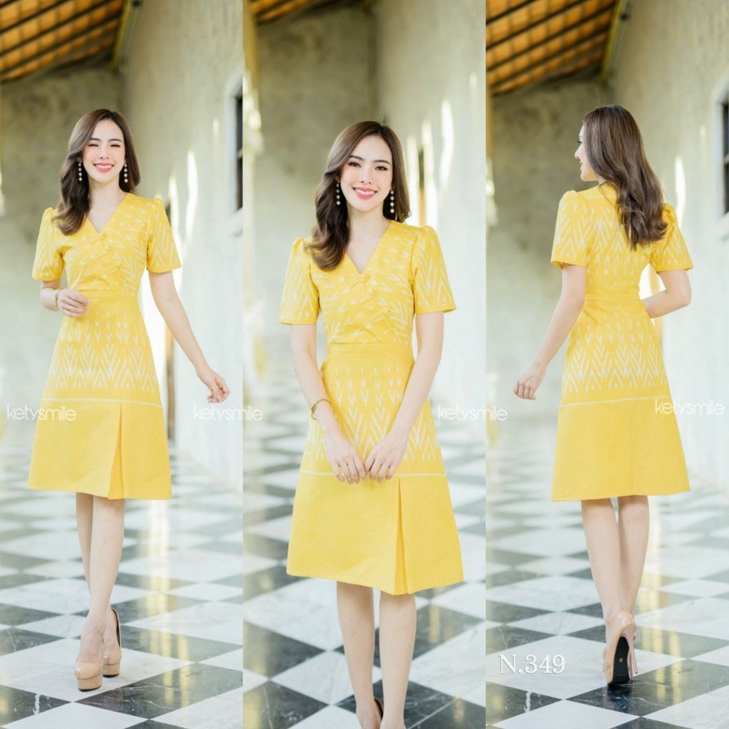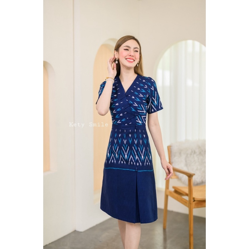 Kety Smile เดรสผ้าฝ้ายมัดหมี่ ทรงเอกระโปรงทวิส อัดกาว งานขายดีอับดับหนึ่ง N349 (S-2XL)