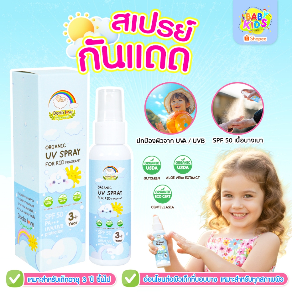 สเปรย์กันแดด DODO LOVE ORGANIC UV SPRAY FOR KID SPF50 PA+++ สำหรับเด็ก ปกป้องผิวจากรังสี UVA และ UV