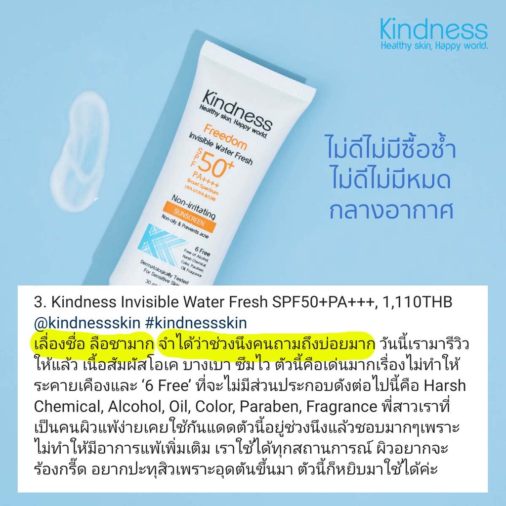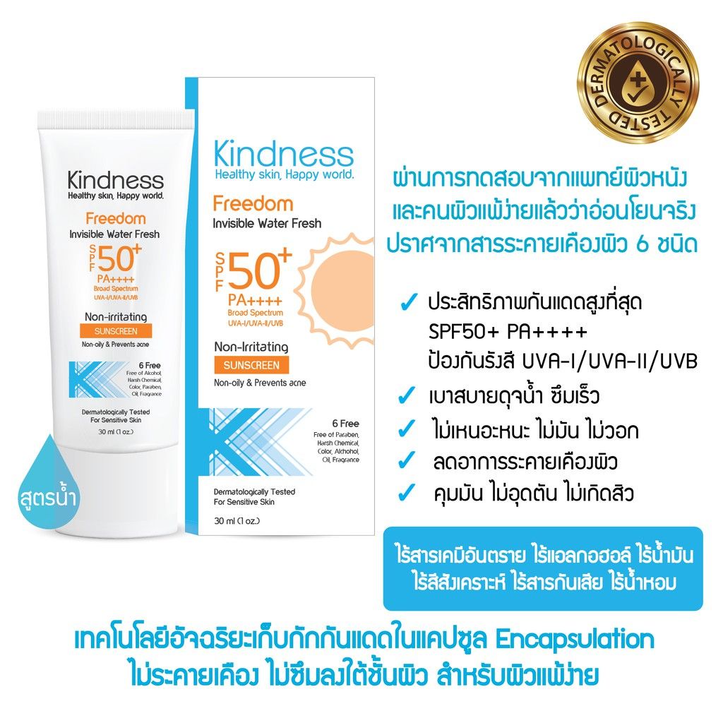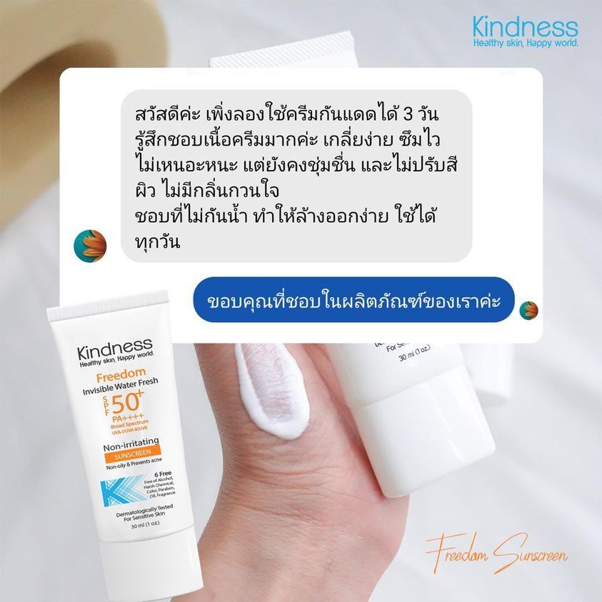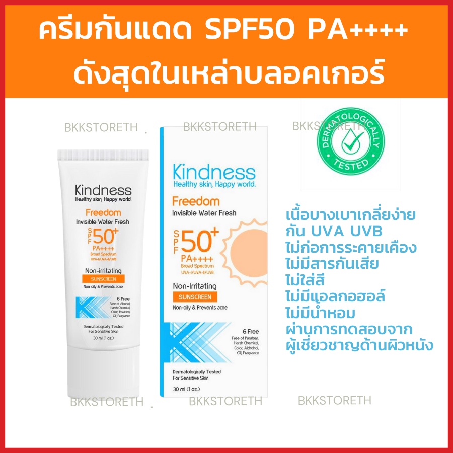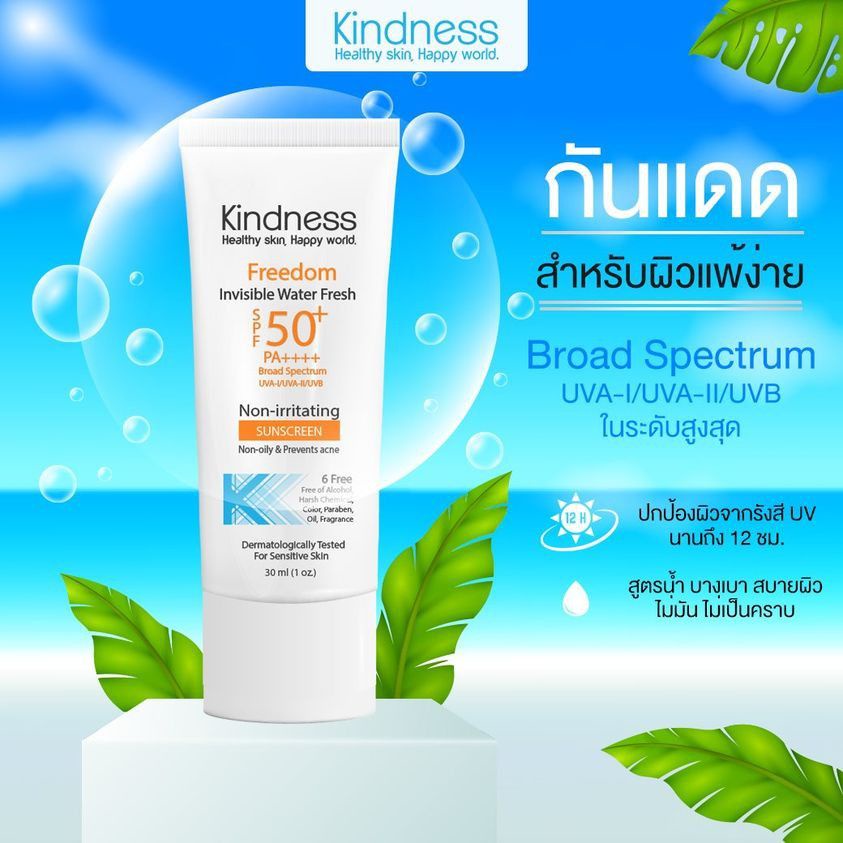 ☀️ครีมกันแดด Kindnessเนื้อบางเบาดุจน้ำ หน้าไม่เทา Kindness Freedom Invisible Water Sunscreen SPF50 PA++++