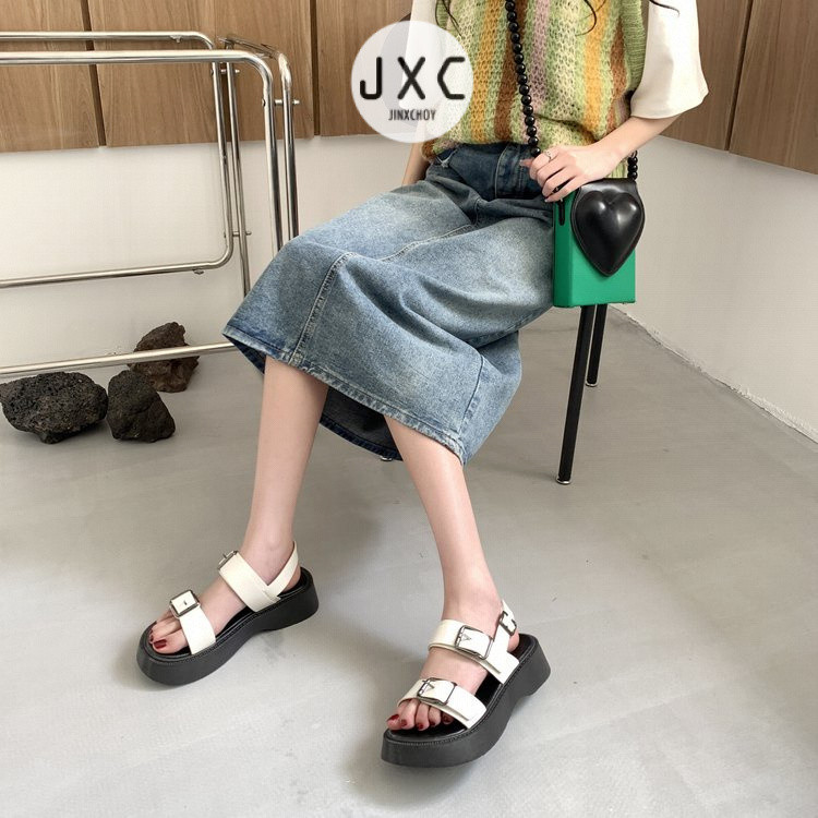 รองเท้าแตะ เปิดนิ้วเท้า ส้นแบน หัวมน พื้นหนา แต่งหัวเข็มขัด แบบเรียบง่าย แฟชั่นทันสมัย สําหรับผู้หญิง