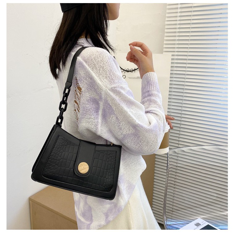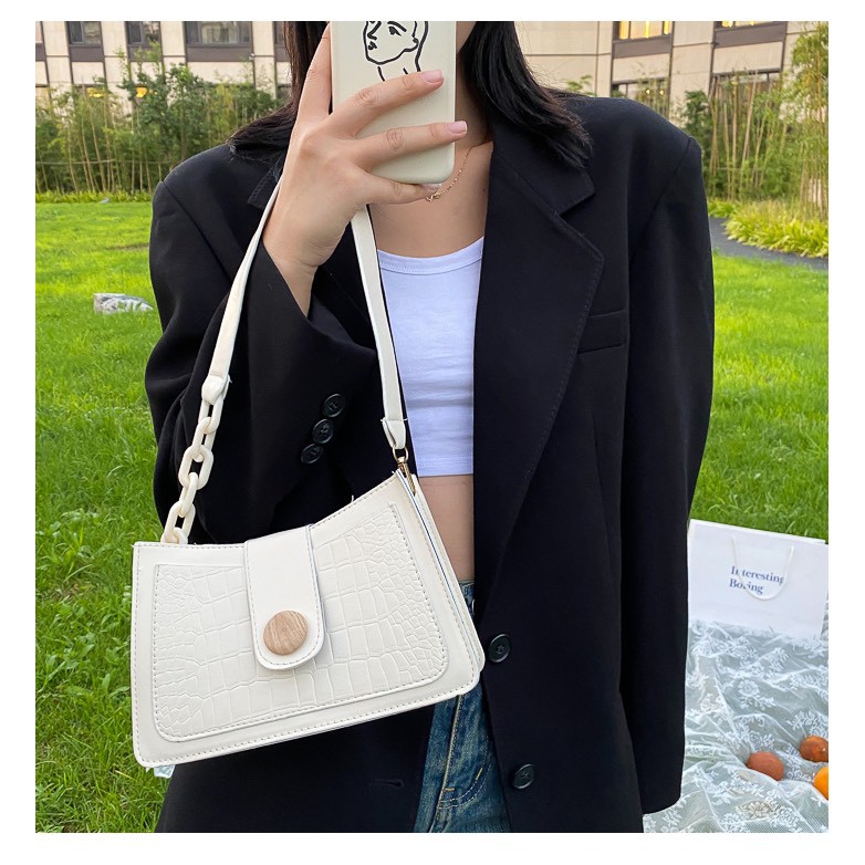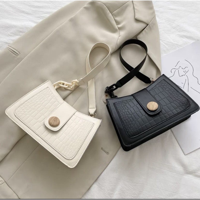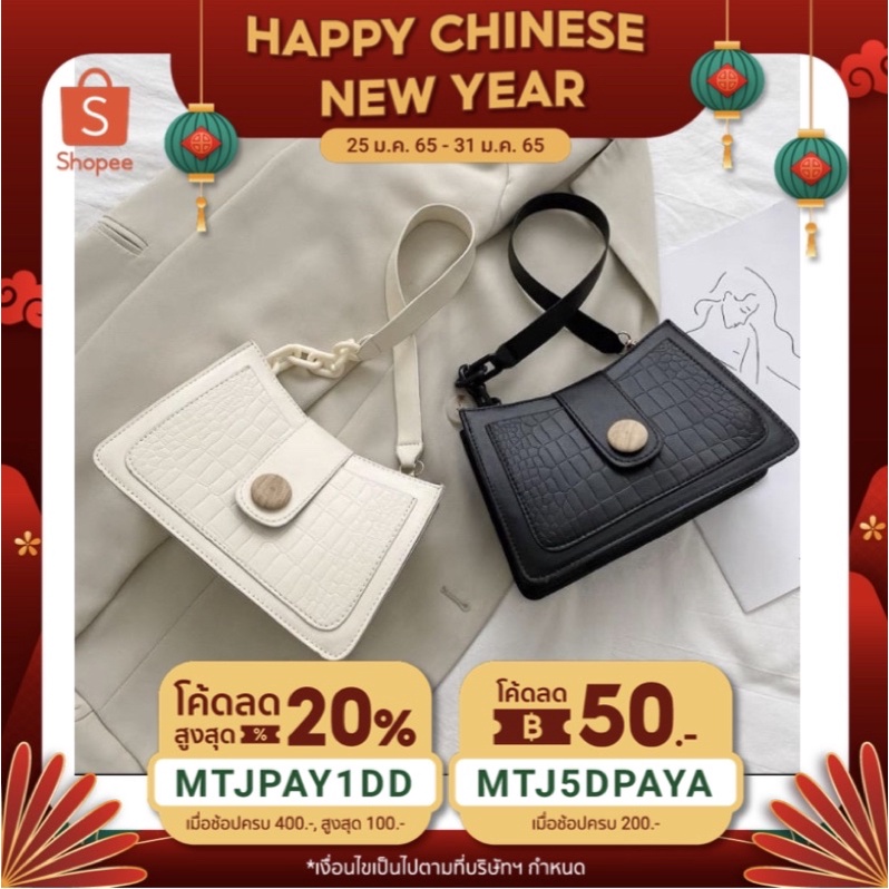 กระเป๋าสะพายข้างทรงสี่เหลี่ยม หนังนิ่ม สายโซ่ ดีไซด์ใหม่กระดุมไม้ (8นิ้ว)