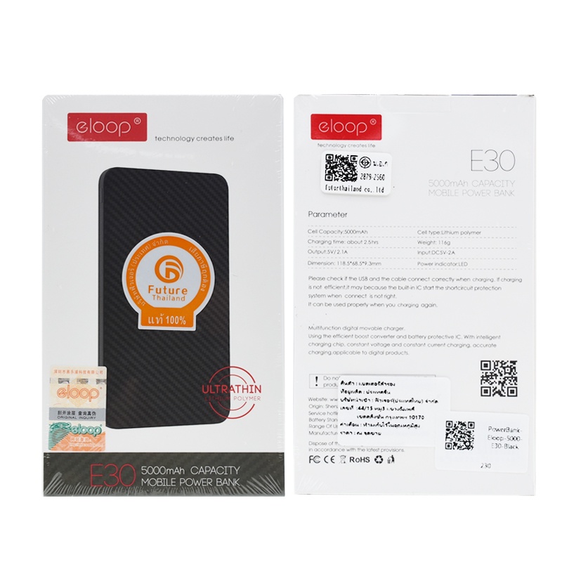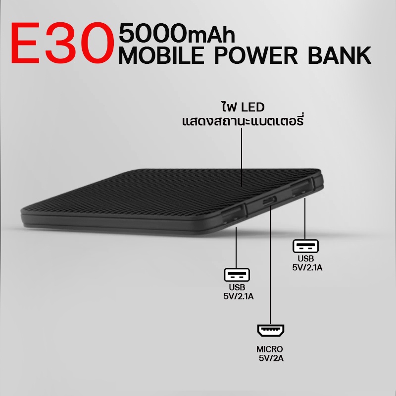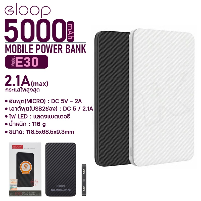 แบตสำรอง Eloop รุ่น E30 ชาร์จเร็ว ความจุแบตเตอรี่ 5000mAh. ไฟLED แสดงแบตเตอรี่ ลายเคฟล่า