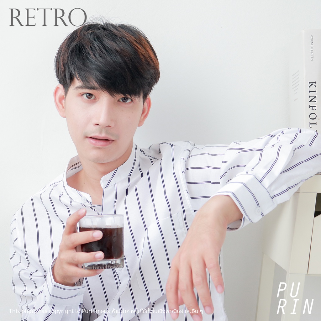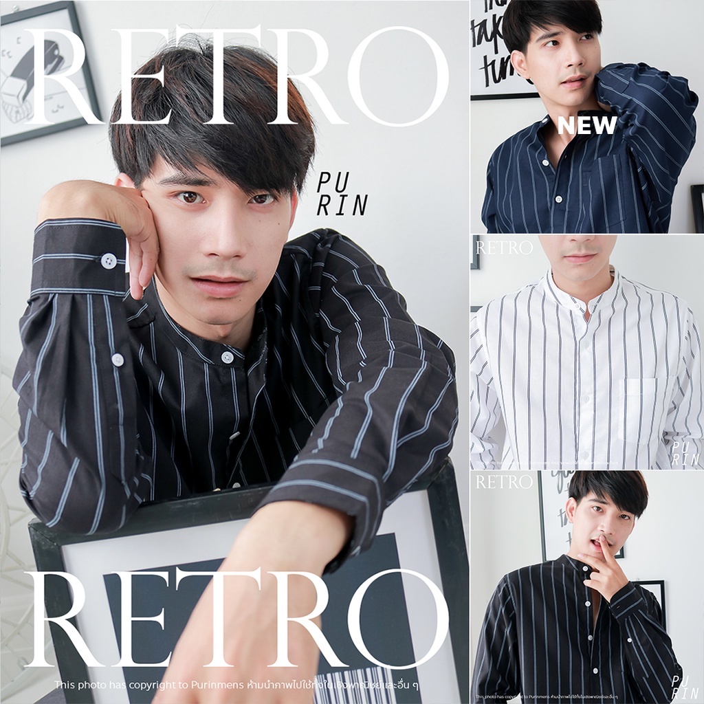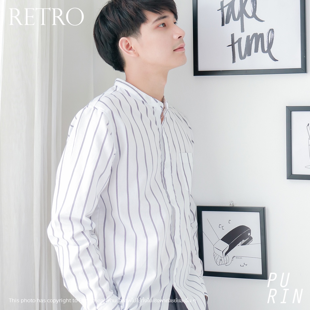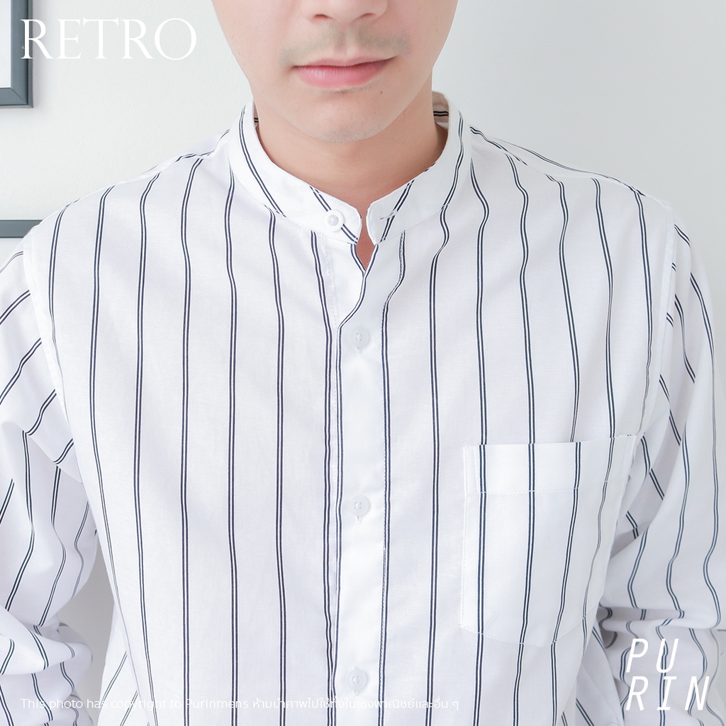 Purinmens Retro เสื้อเชิ้ตผ้าคอตตอนผสมลินินคอจีน ลายทาง สีขาว สีดำ สีกรม ดีไซน์เรียบง่าย แมทชง่ายกับกางเกงสแล็ค และยีนส์