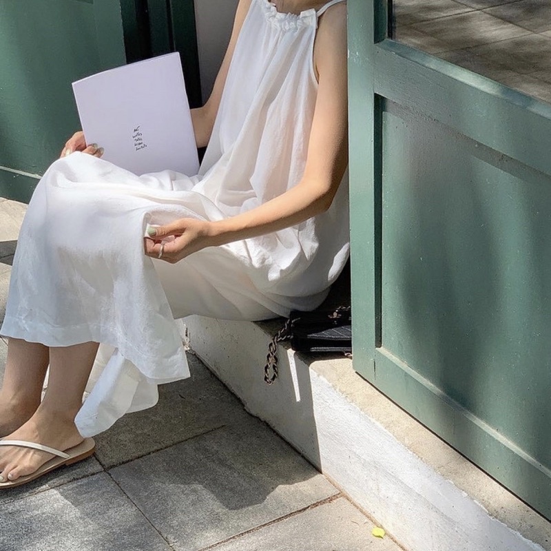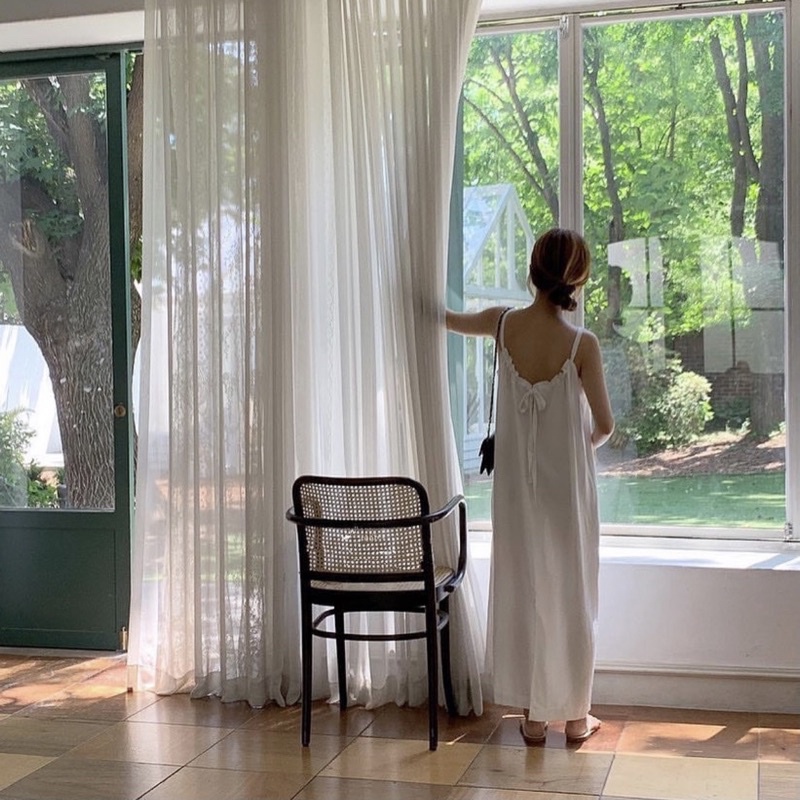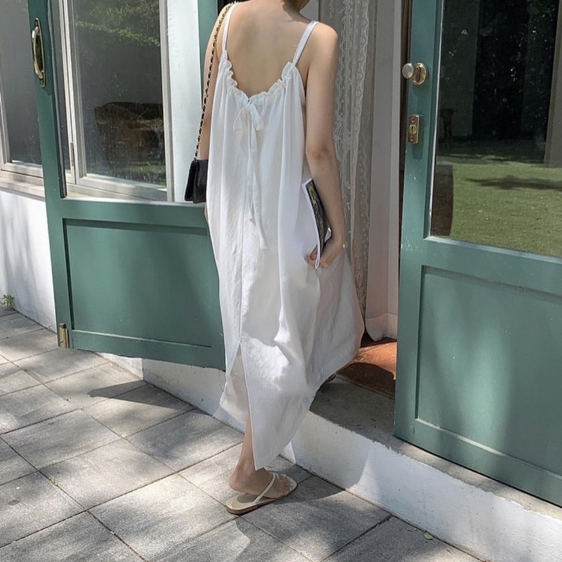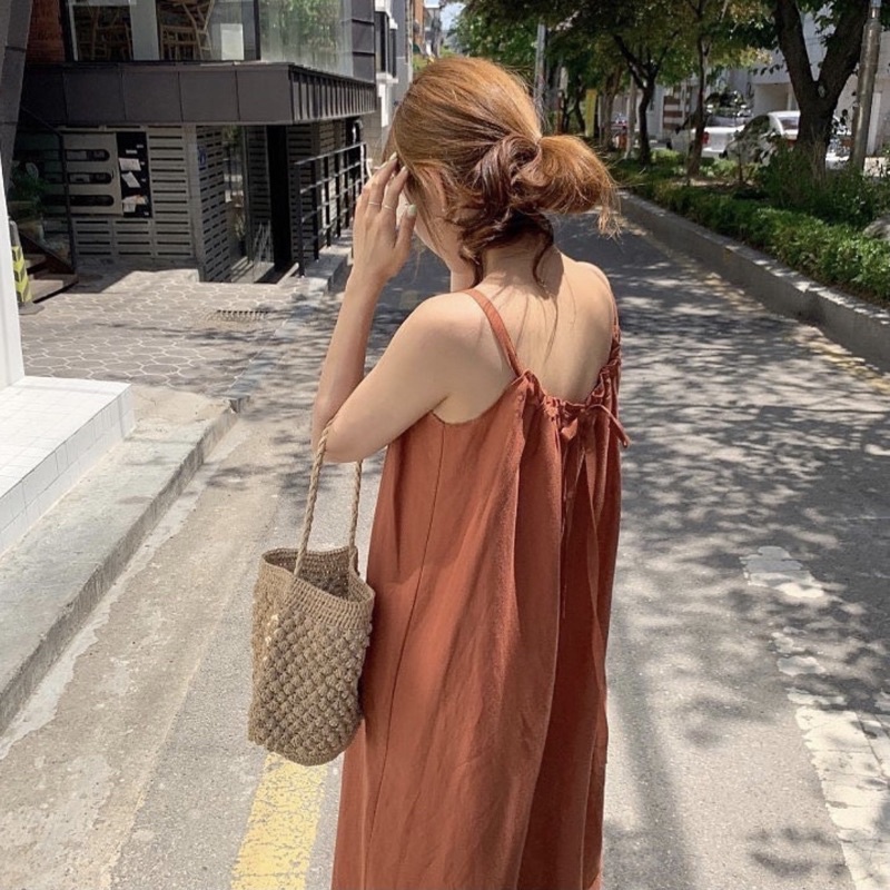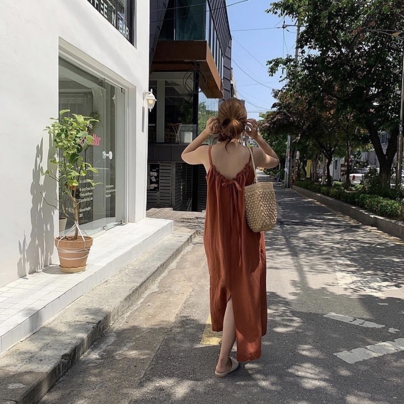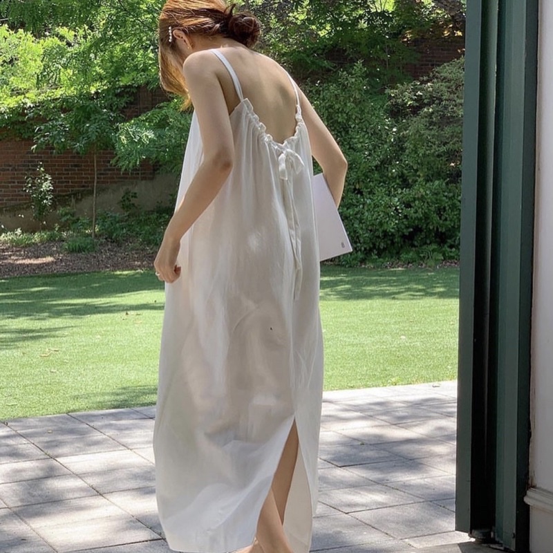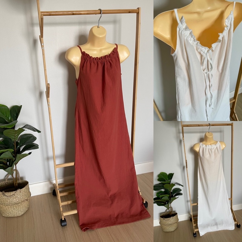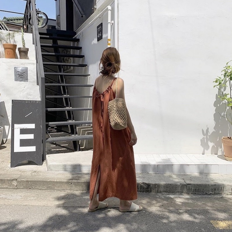 Maxi dress เดรสยาวสไตล์มินิมอล ผูกเชือกหลัง รูดเชือกผูกโบว์ด้านหลัง ผ้าคอตตอนผสมลินิน