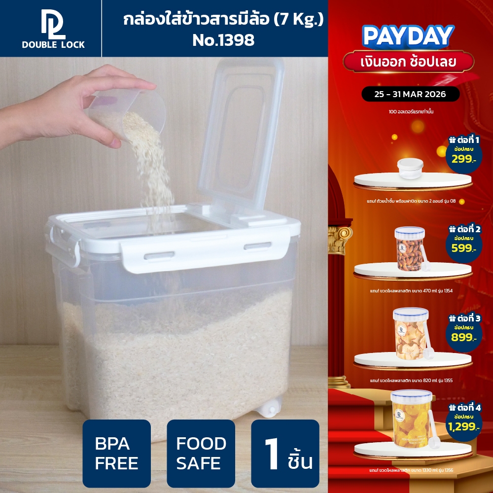 Double Lock กล่องใส่ข้าวสารมีล้อ พร้อมถ้วยตวง ความจุ 7 กก. รุ่น 1398