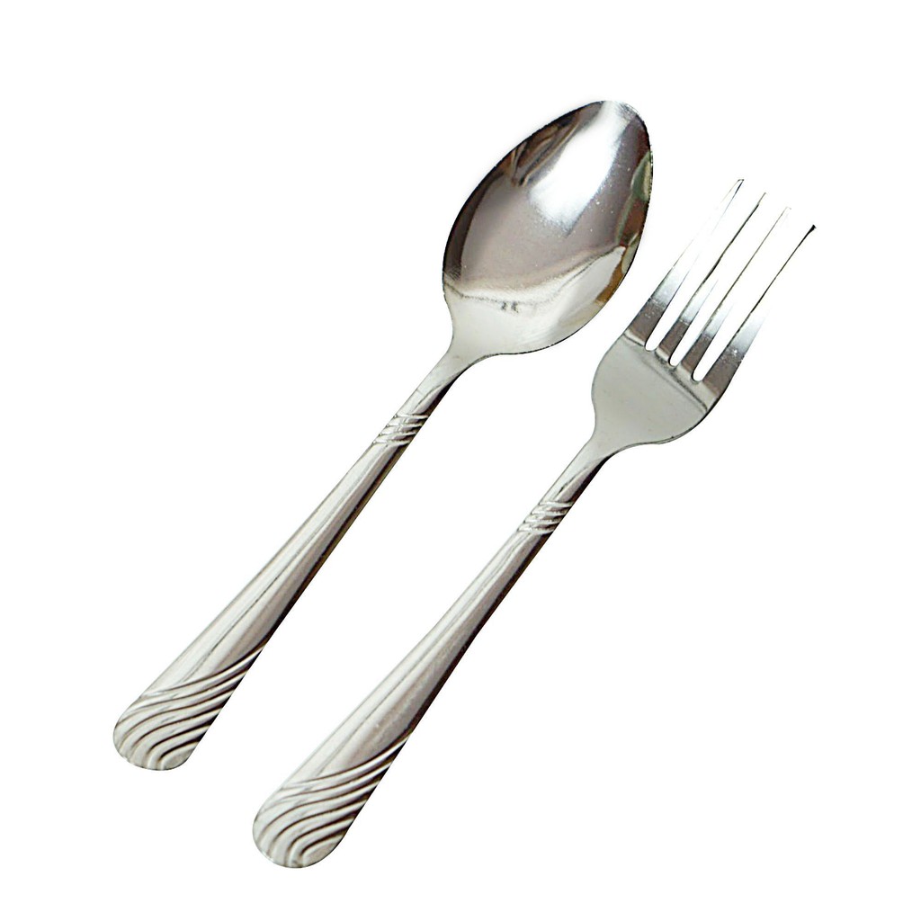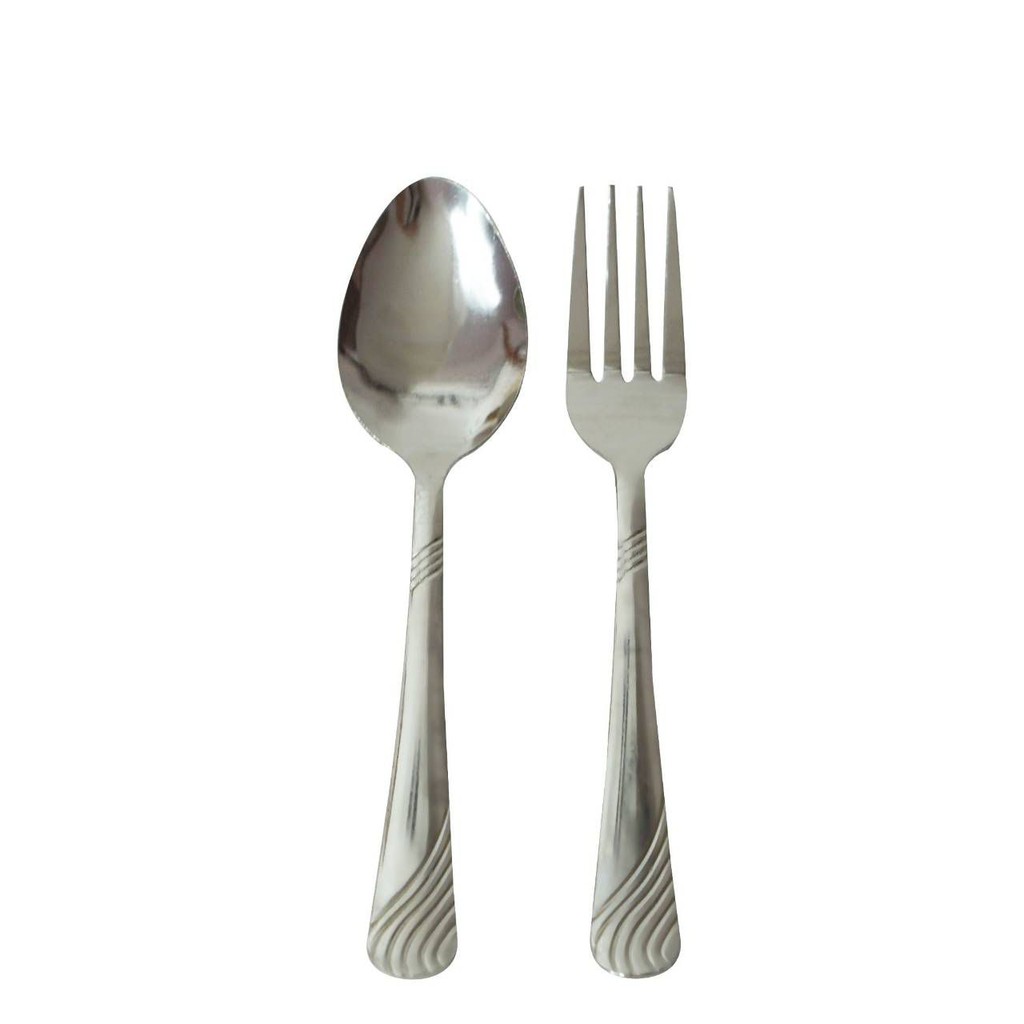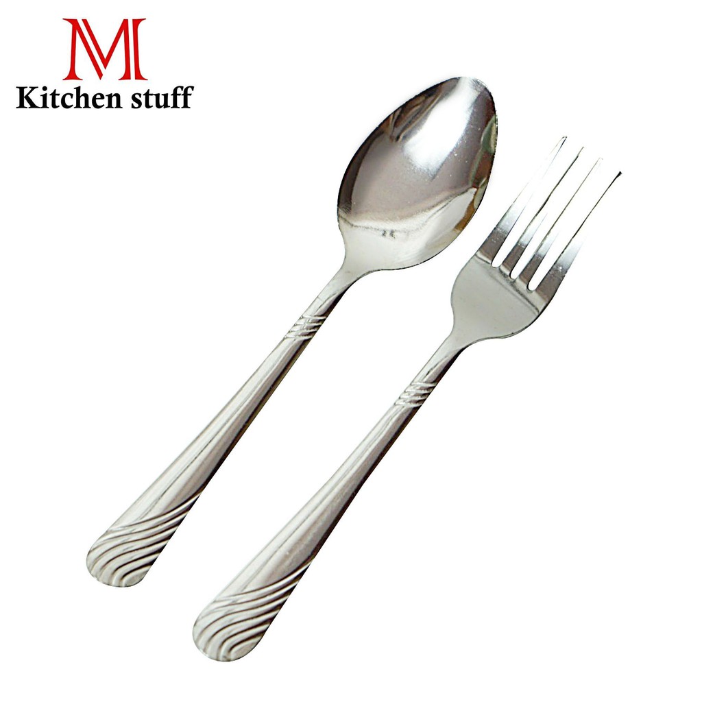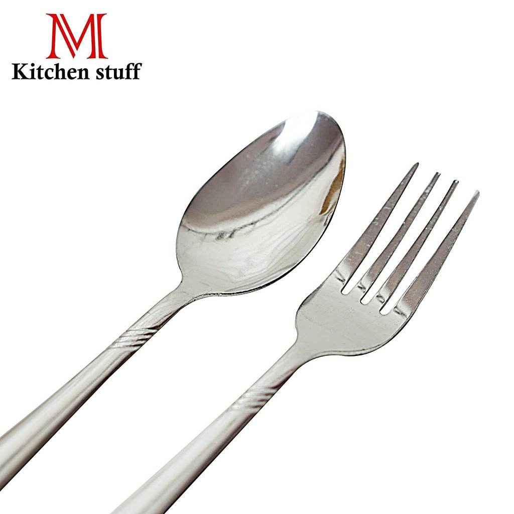 M KITCHEN F1 ช้อนส้อม ช้อน ช้อนสแตนเลส 1 คู่ F1 หนา 0.5 มล. ยาว 18 cm ด้ามแบนพิมพ์ลาย (A8)