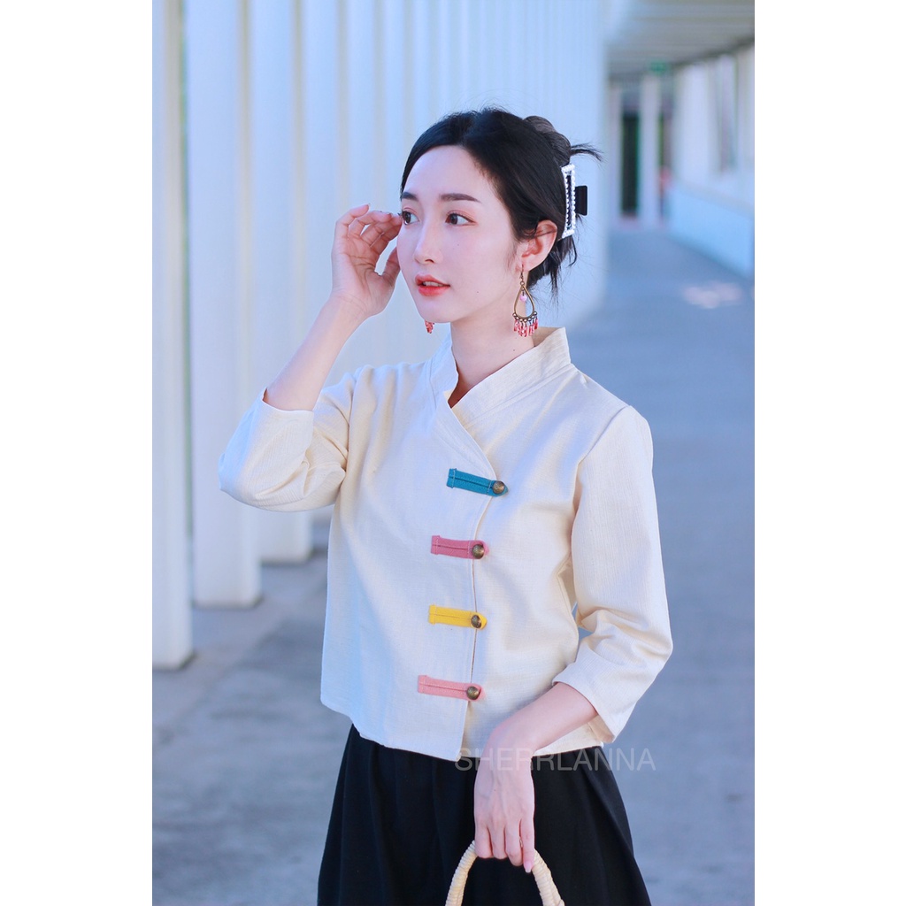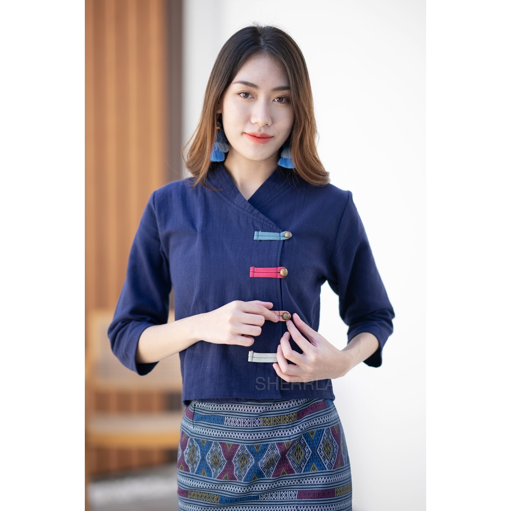 เสื้อผ้าฝ้ายพื้นเมืองทรงป้ายหน้า แต่งกระดุมเส้นสี