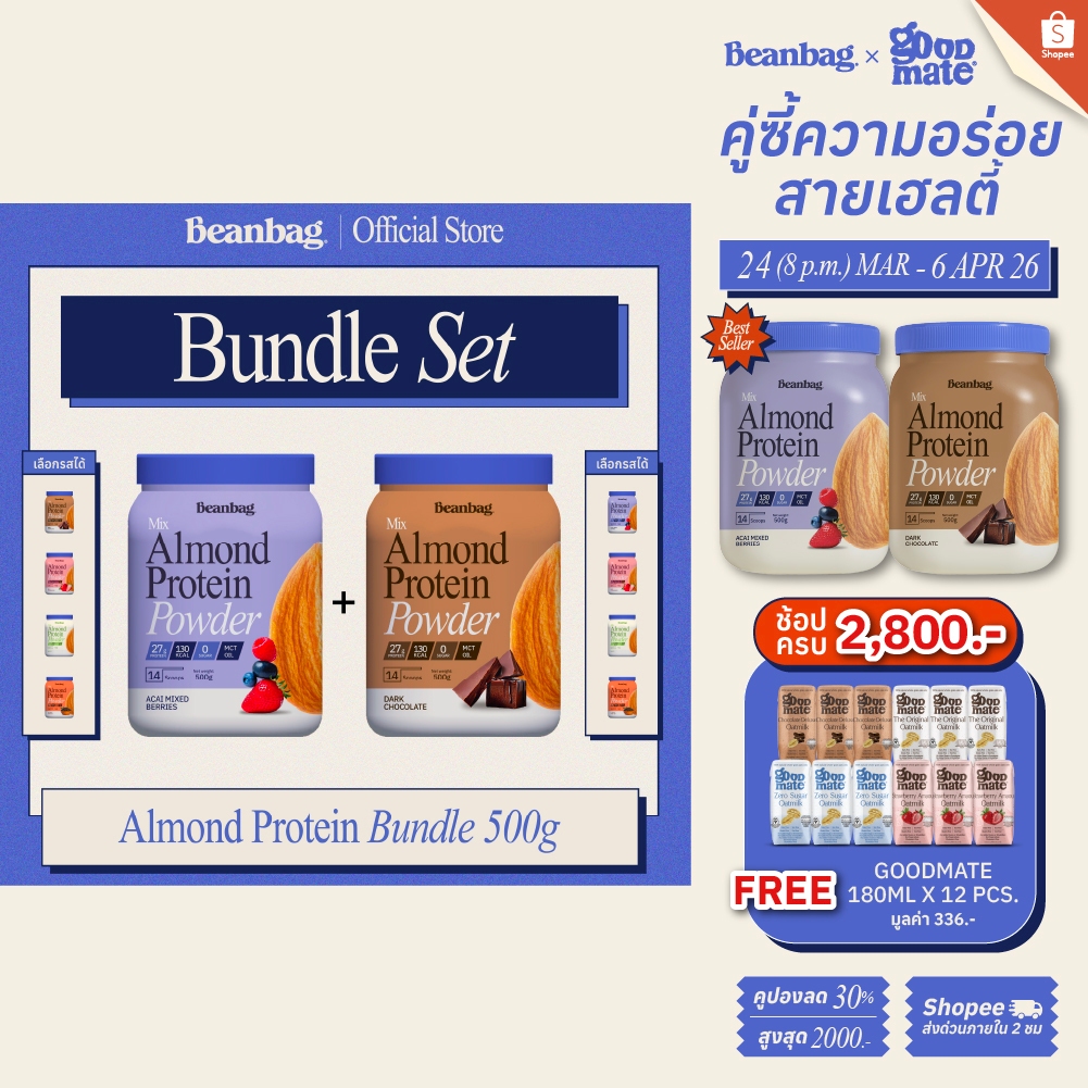 [เซ็ทคู่คุ้มกว่า] Beanbag : Bundle Set Mix Almond Protein Powder 500g โปรตีนอัลมอนด์ และพืช 5 ชนิด 2 กระปุก คละรสชาติได้
