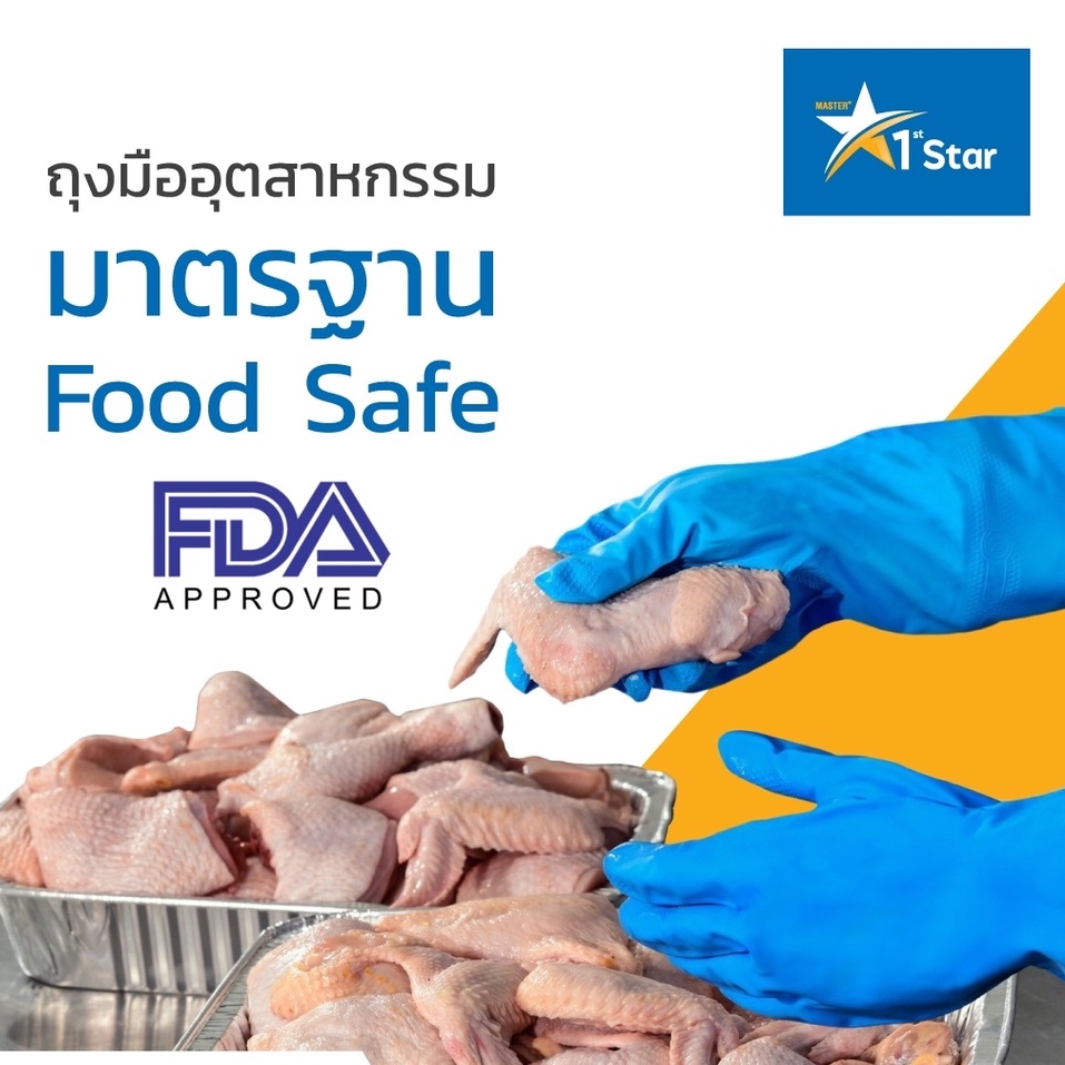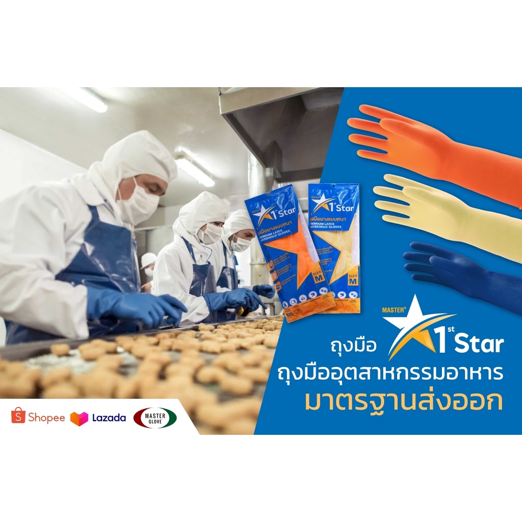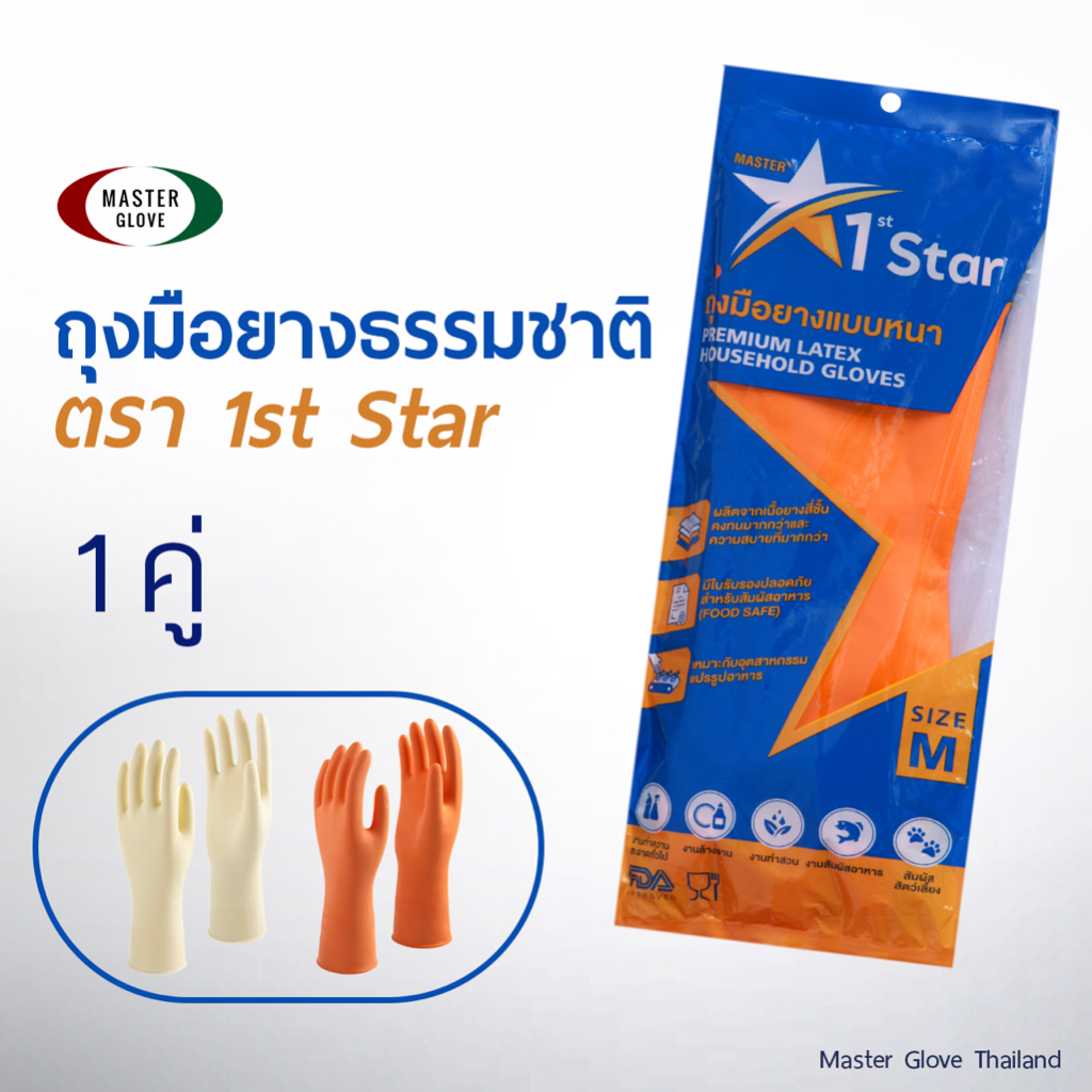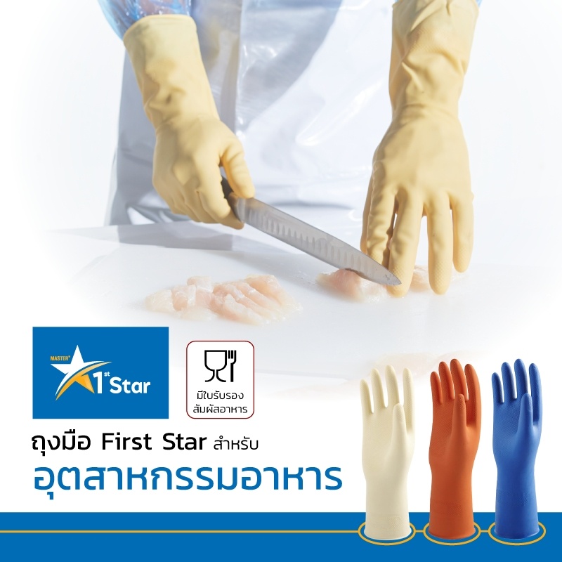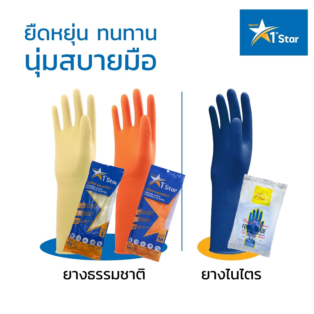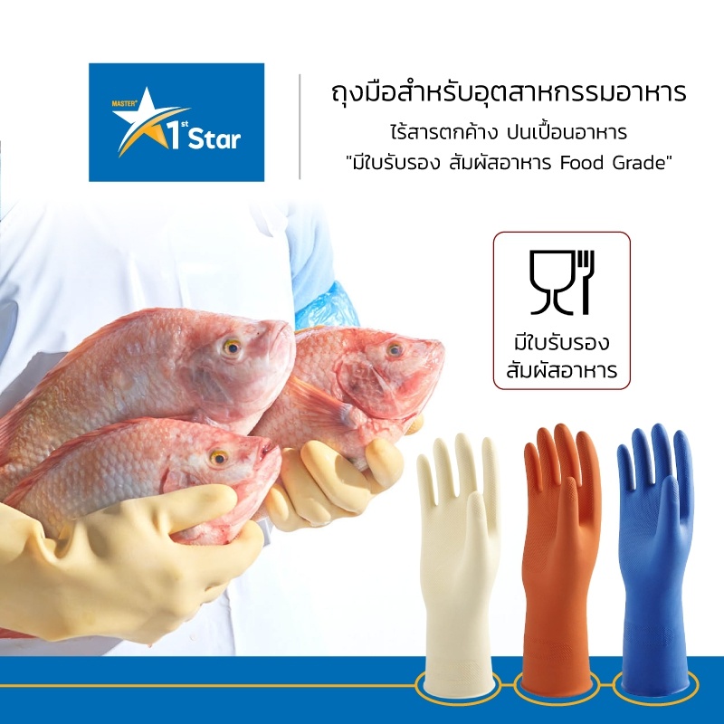 1 คู่ - ตรา 1st STAR ถุงมือยางธรรมชาติ/ไนไตร สัมผัสอาหารแบบหนา สีส้ม/เนื้อ