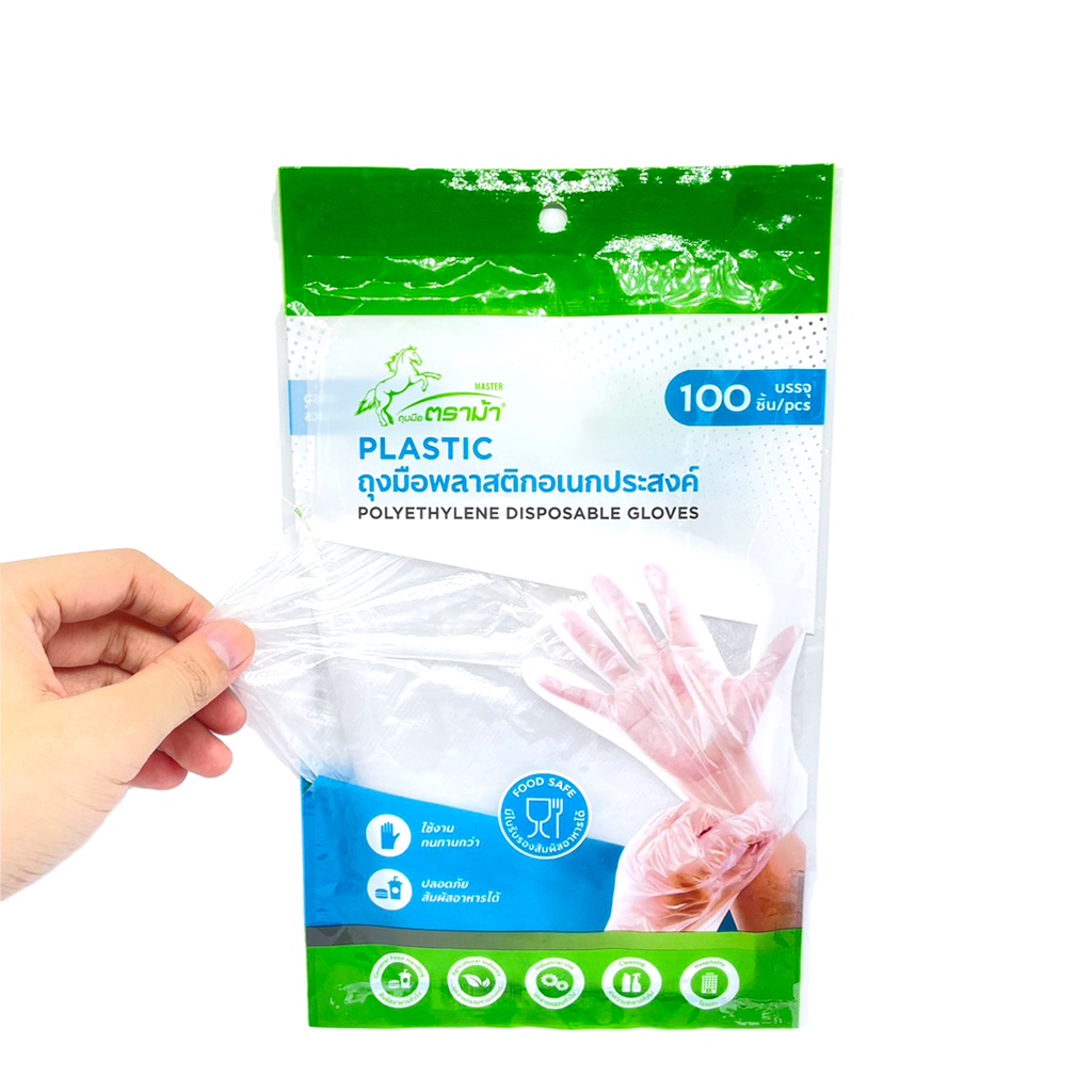 1 ซอง(100 ชิ้น) - ถุงมือพลาสติก "ตราม้า" ถุงมือประกอบอาหาร เอนกประสงค์ ใช้แล้วทิ้ง/ MASTER GLOVE [ ลูกค้าใหม่ 1 บาท 🔥 ]