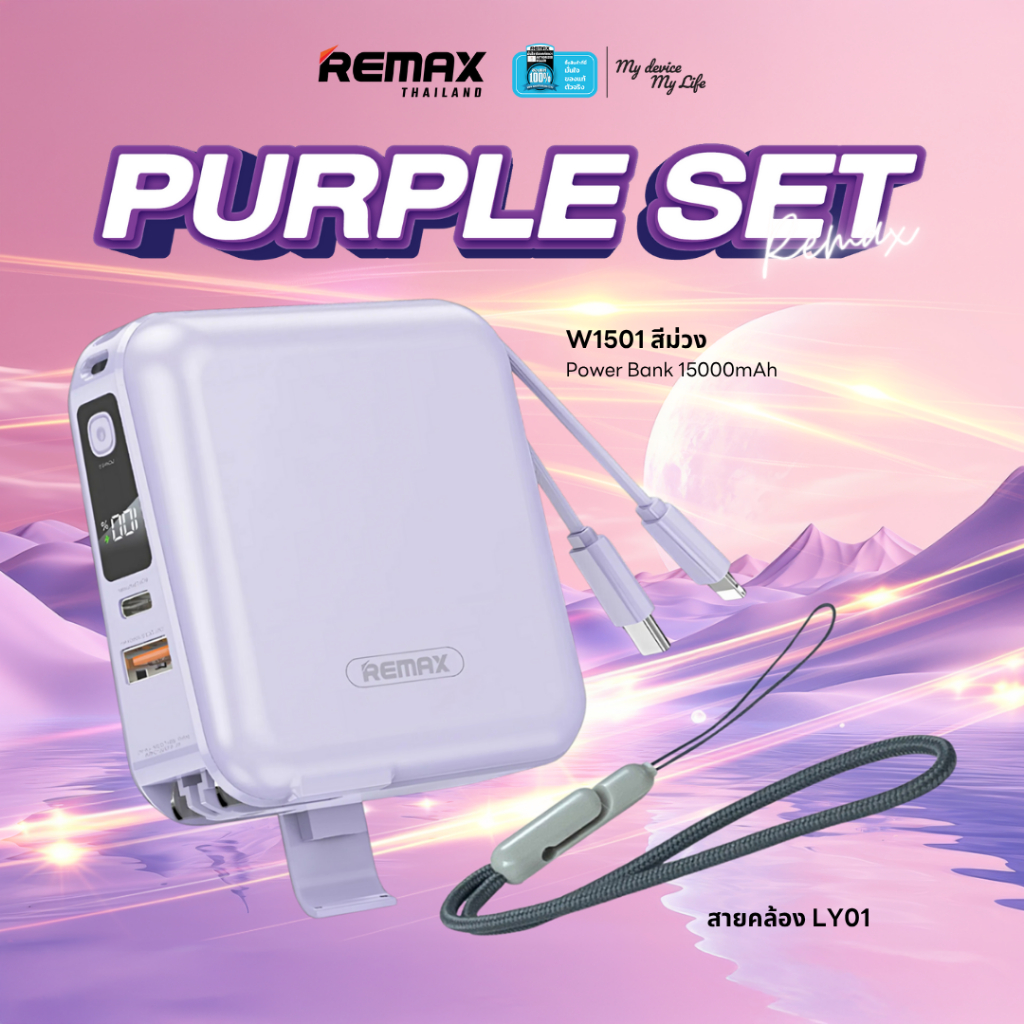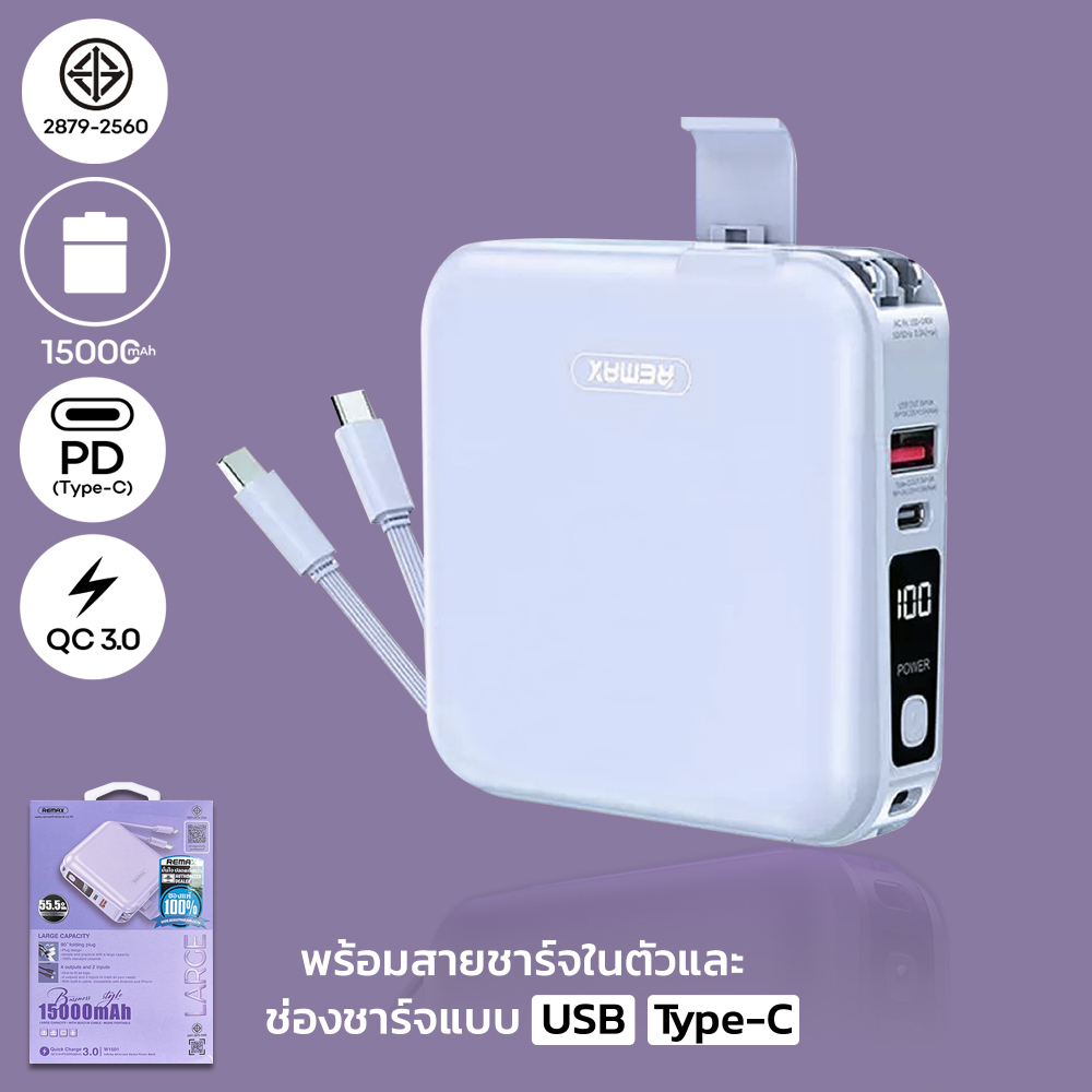 Remax Power Bank ความจุ 15,000 mAh (W1501) - แบตสำรอง ชาร์จไว มีสายชาร์จและปลั๊กในตัว