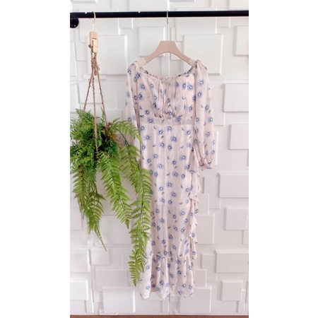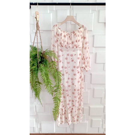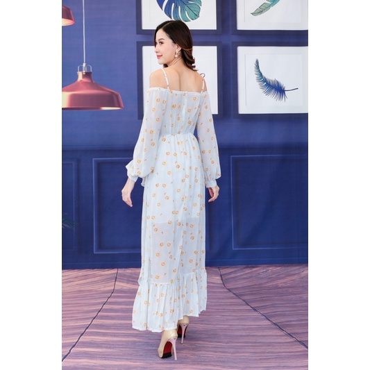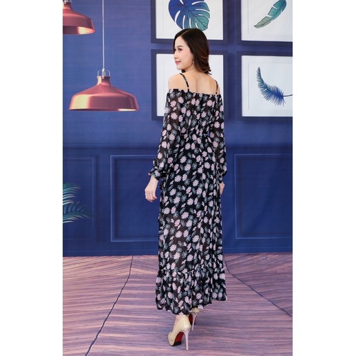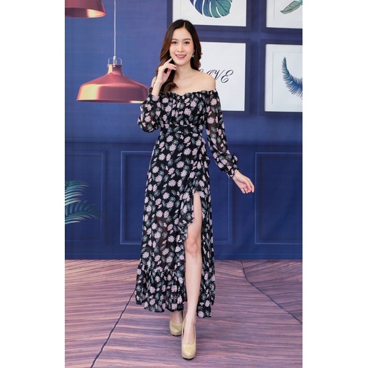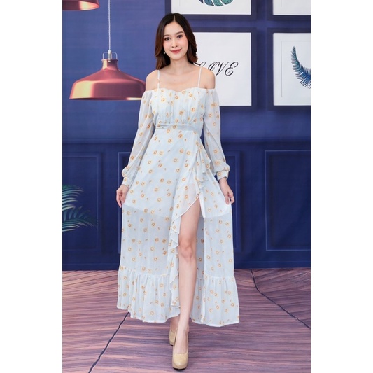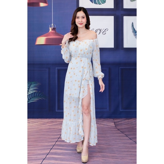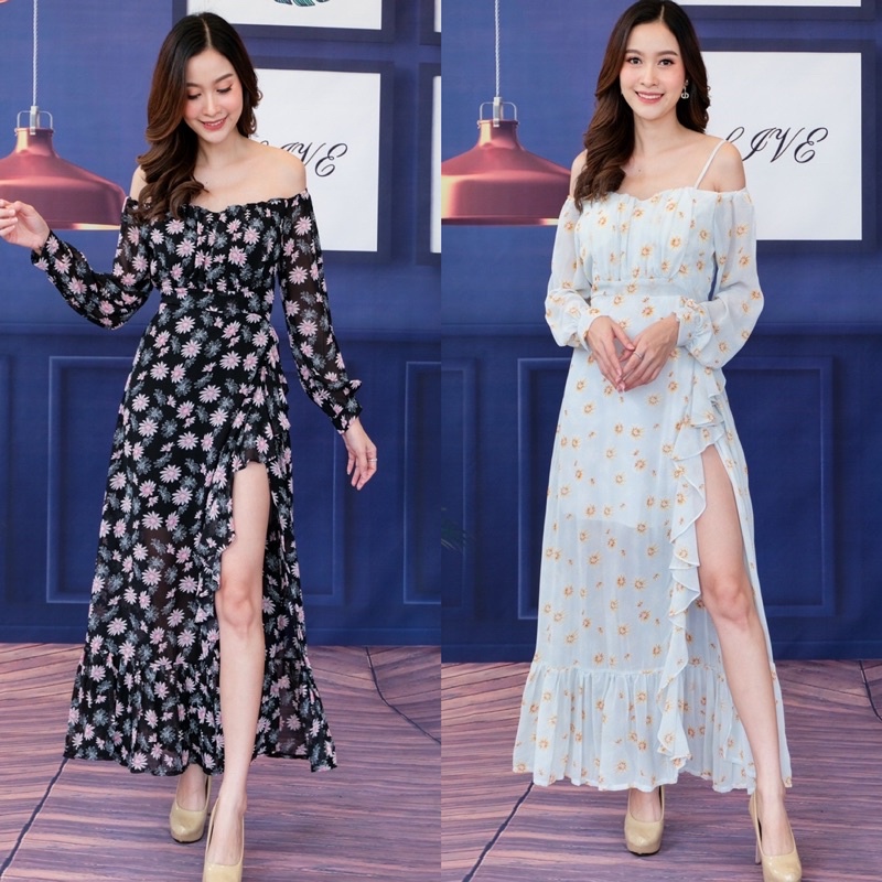เดรสปาดไหล่ เปิดไหล่ ชุดเที่ยวทะเล แม็กซี่เดรส ลายดอก ผ้าพริ้ว