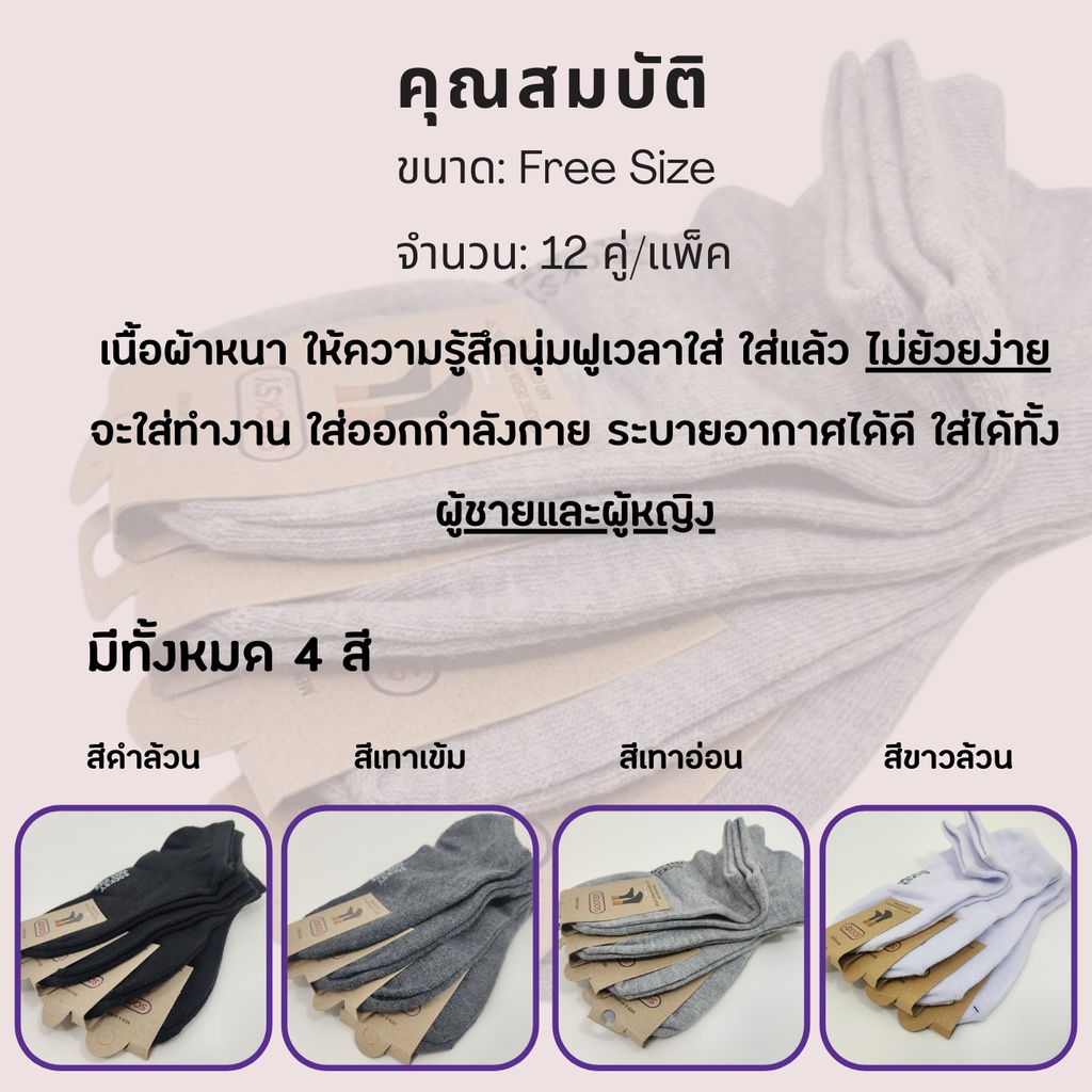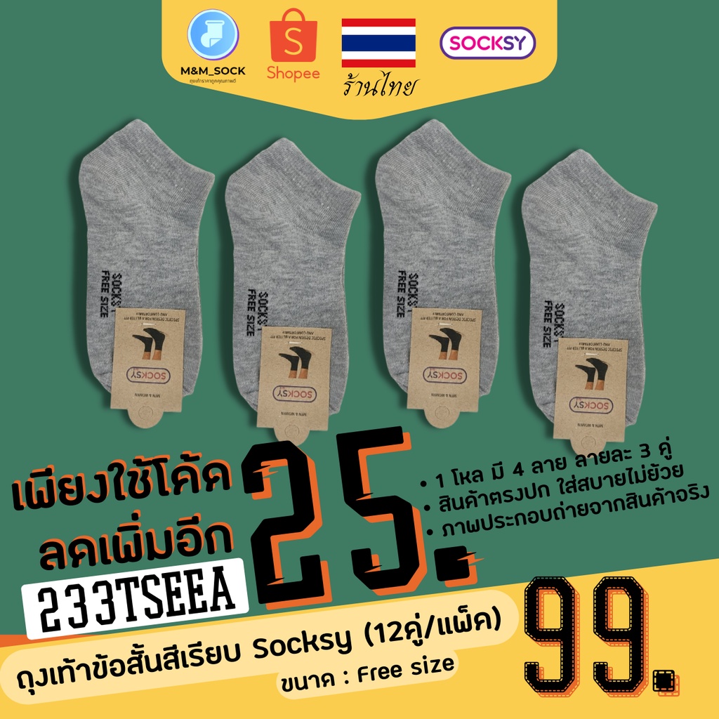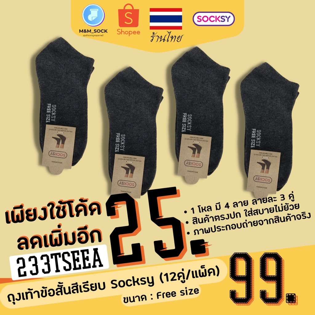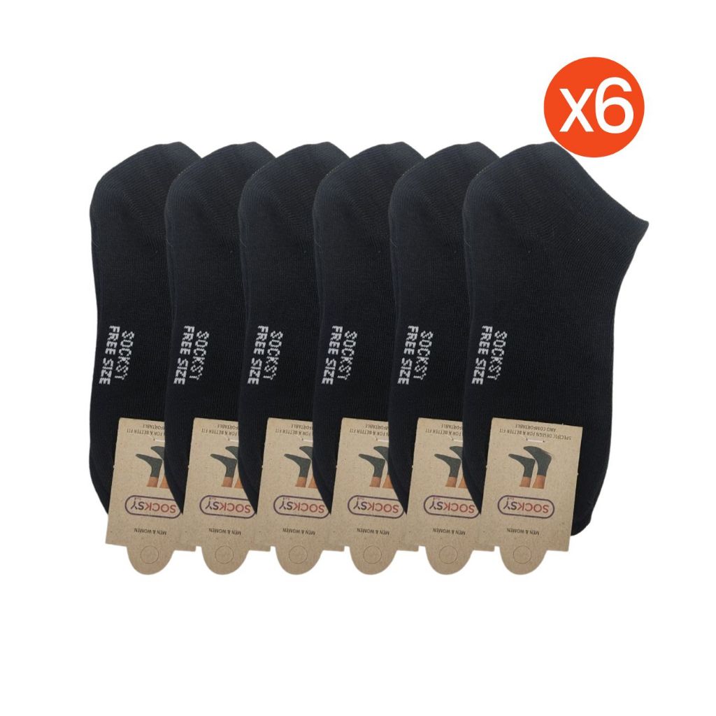 ถุงเท้าข้อสั้น (12คู่/แพ็ค) Socksy สีพื้น สีเรียบ ใส่ทำงาน ใส่ออกกำลัง ดำ/เทา/เทาอ่อน/ขาว