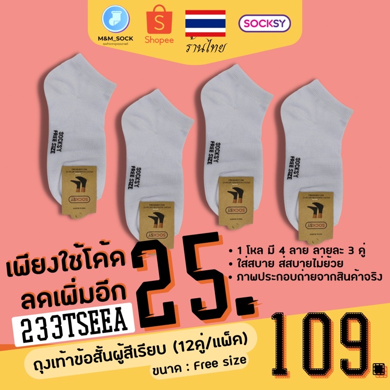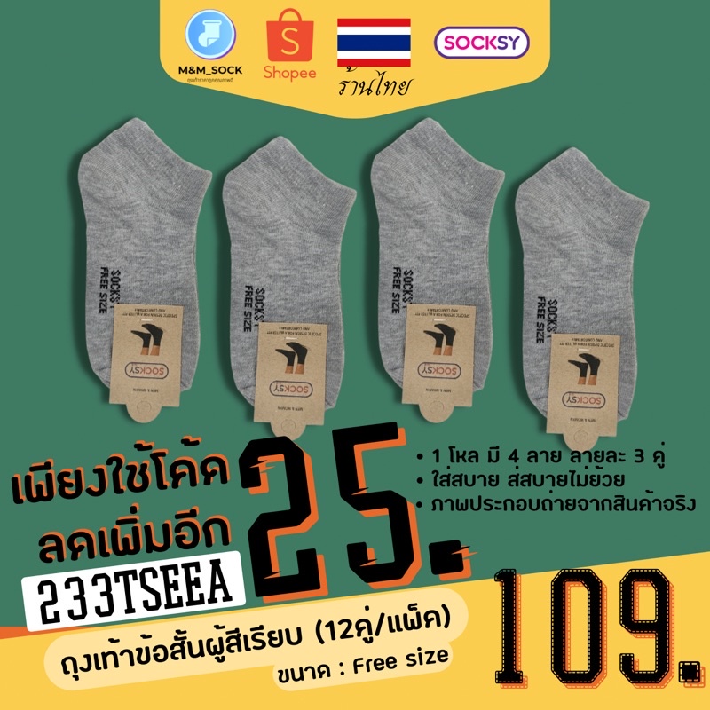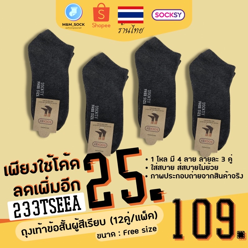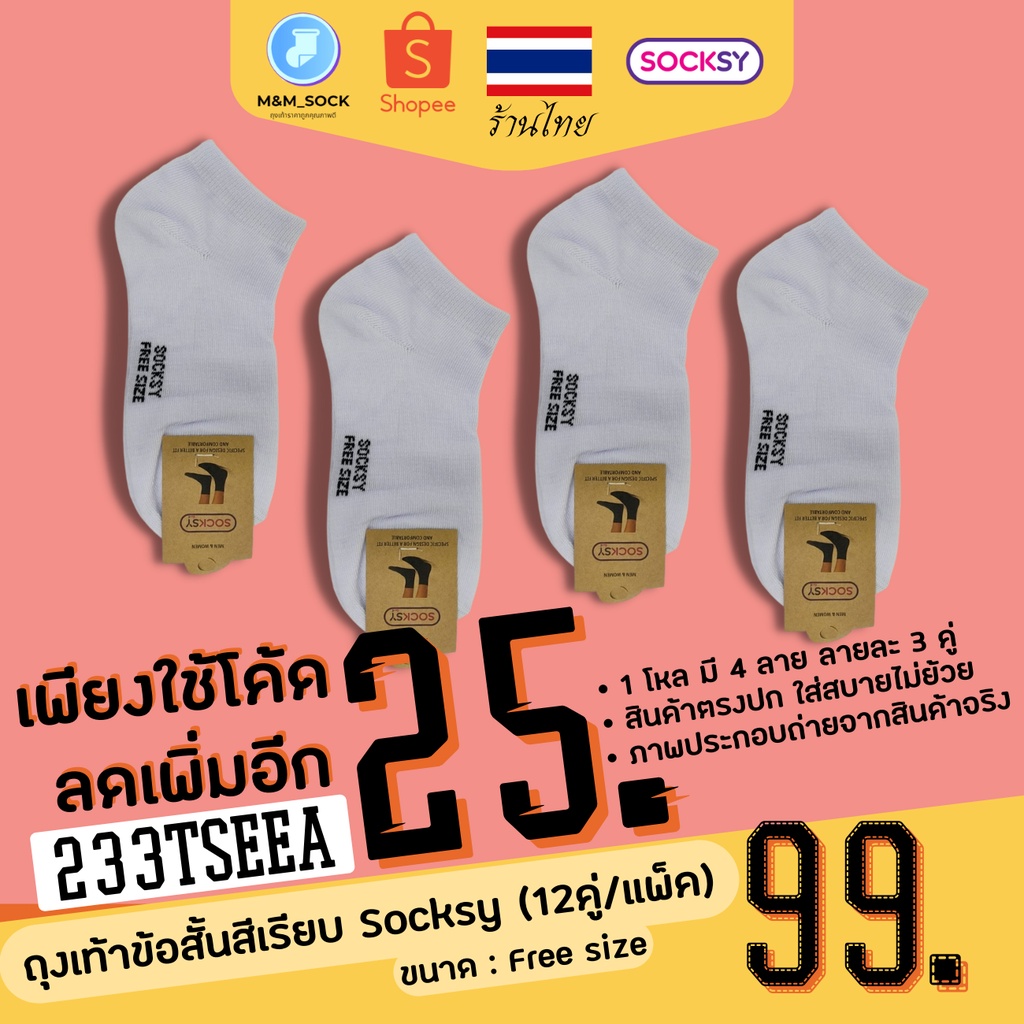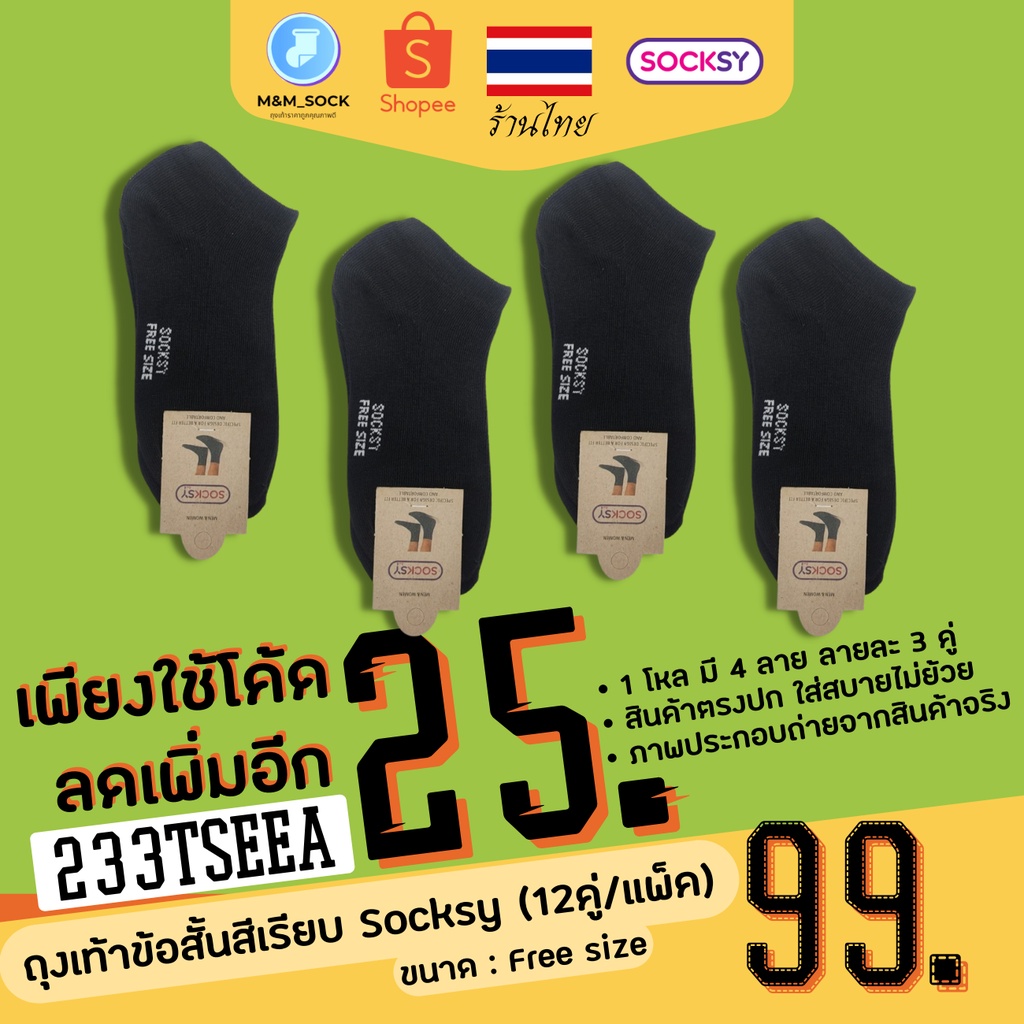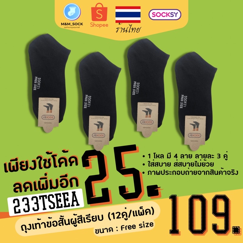 ถุงเท้าข้อสั้น (12คู่/แพ็ค) Socksy สีพื้น สีเรียบ ใส่ทำงาน ใส่ออกกำลัง ดำ/เทา/เทาอ่อน/ขาว