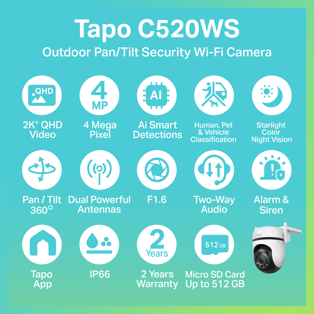 TP-Link Tapo C520WS กล้องไวไฟ 4MP 2K+ QHD ใช้งานภายนอก Starlight Color Night Visionให้ภาพสีได้ดีแม้แสงน้อย IP66 Smart AI