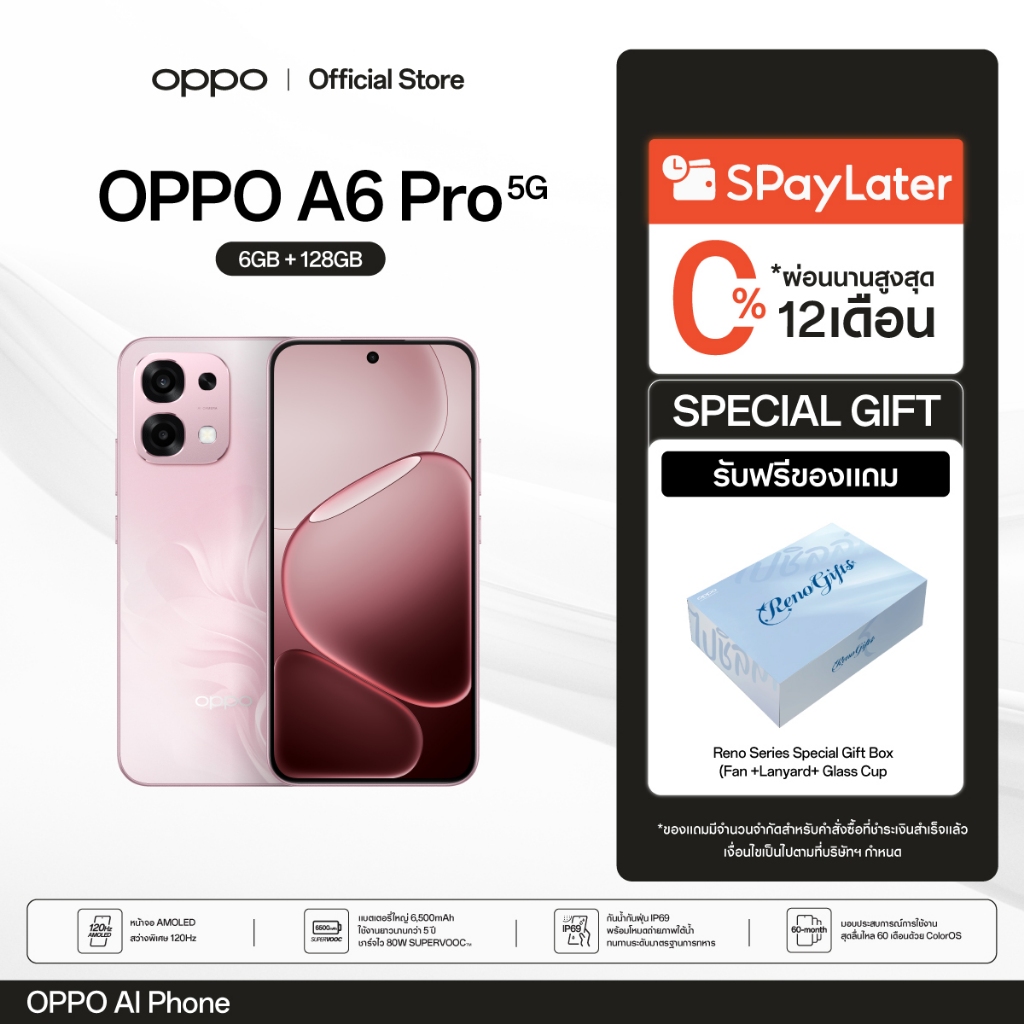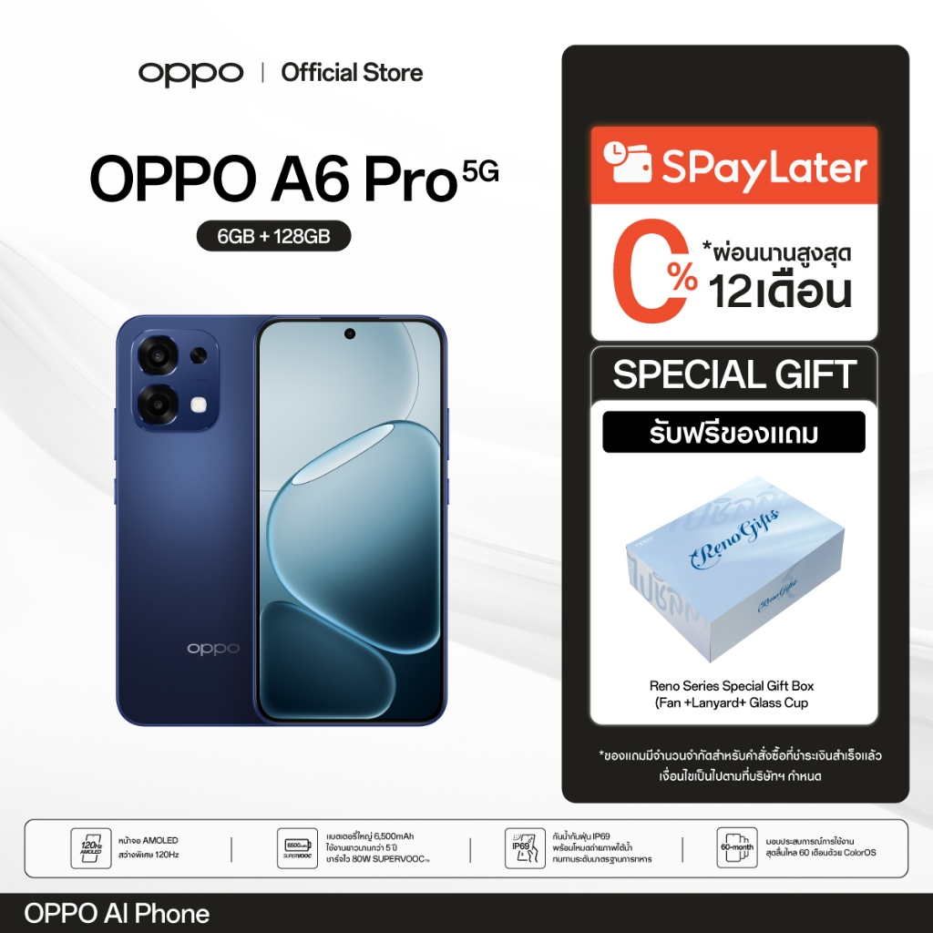 [New]OPPO A6 Pro 5G (6+128G) โทรศัพท์มือถือ ทนทาน กันน้ำ/กันฝุ่น IP69 กล้อง 50 MP ชาร์จไว 80W แบตเตอรี่ขนาดใหญ่ 6500 mAh