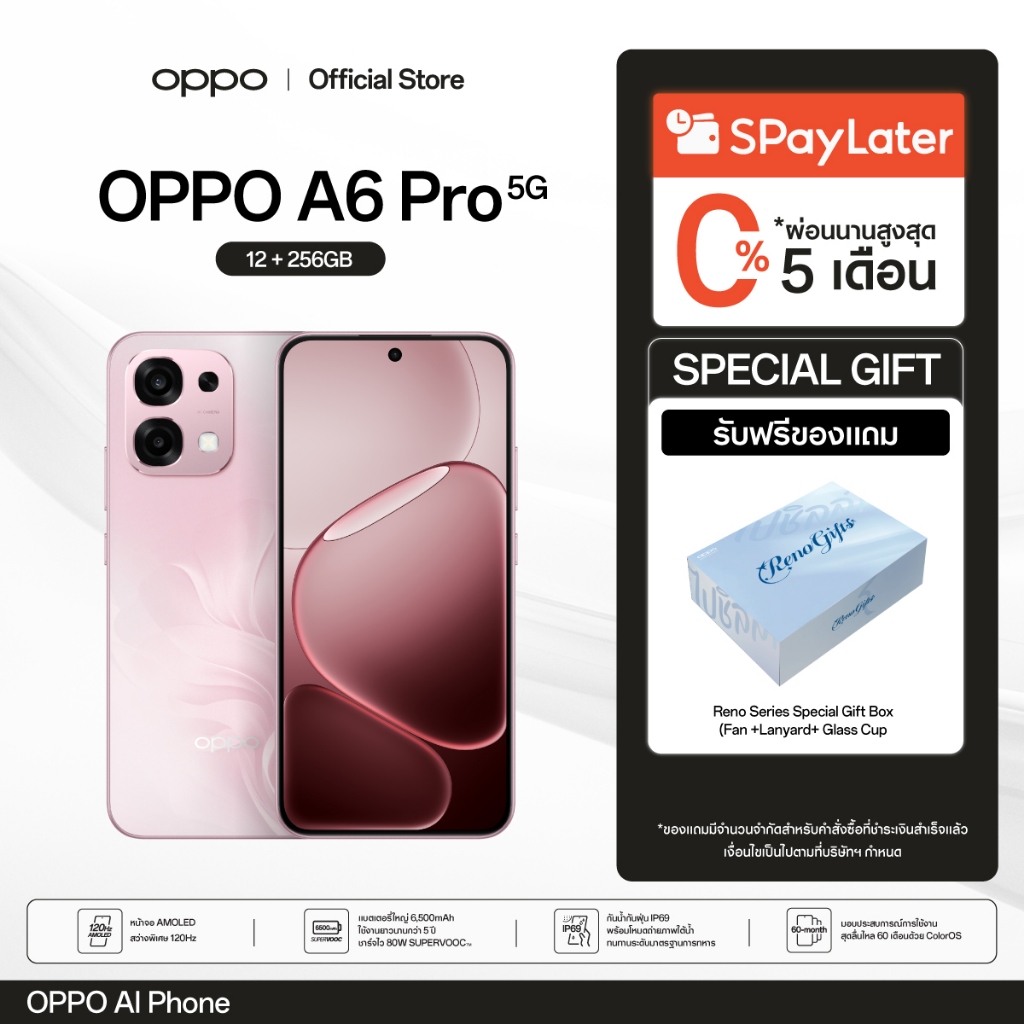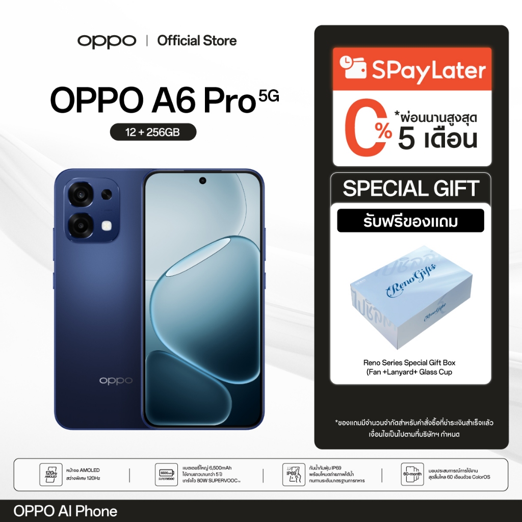 [New] OPPO A6 Pro 5G (12+256G) โทรศัพท์มือถือทนทาน กันน้ำ/กันฝุ่น IP69กล้อง 50 MPชาร์จไว 80Wแบตเตอรี่ขนาดใหญ่ 6500 mAh