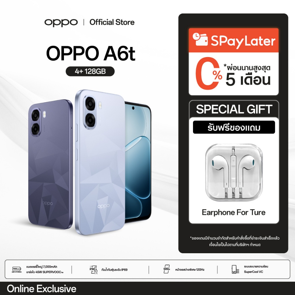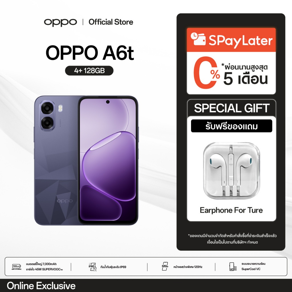 [New] OPPO A6t (4+128G) โทรศัพท์มือถือ แบต 6,500mAh หน้าจอสว่างพิเศษ 120Hz ชิปเซ็ต Snapdragon® 685 4G กันน้ำกันฝุ่น IP64