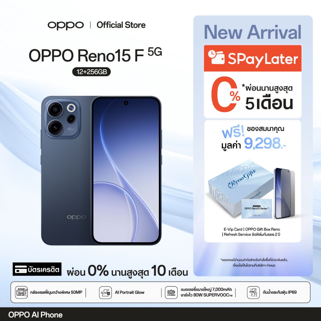 [New]OPPO Reno15 F(12+256G) โทรศัพท์มือถือ กล้องหน้ามุมกว้างพิเศษ 50MP AI Portrait Glow ชาร์จไว80W แบต 7,000mAh