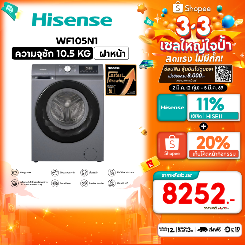HISENSE เครื่องซักผ้าฝาหน้า 10.5 กก. 1400 RPM อินเวอร์เตอร์ รุ่น WF105N1 สีเทา