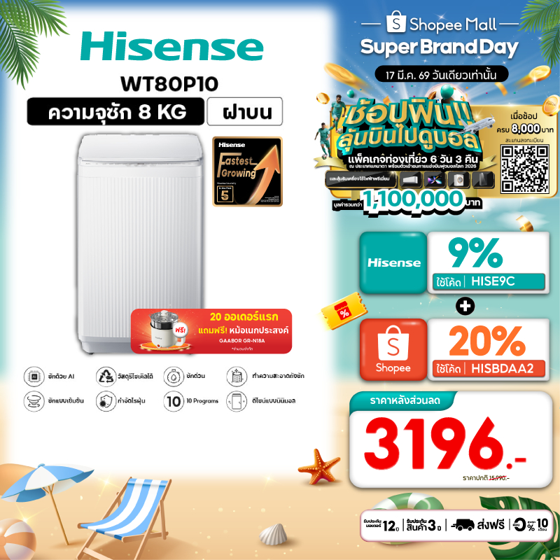 Hisense เครื่องซักผ้าฝาบน รุ่น WT80P10 เครื่องซักผ้า ฝาหน้า 8-16 กก.