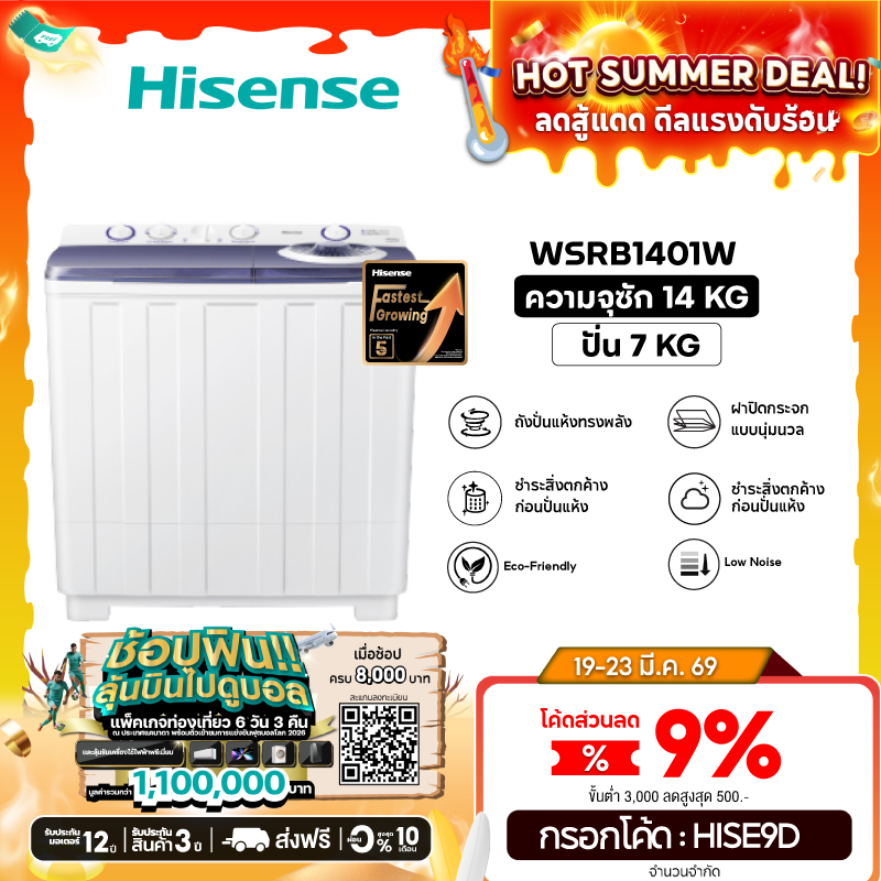 Hisense เครื่องซักผ้าฝาบนสองถัง สีขาว ความจุ 12 กก. /14 กก. รุ่น WSRB1201W / WSRB1401W