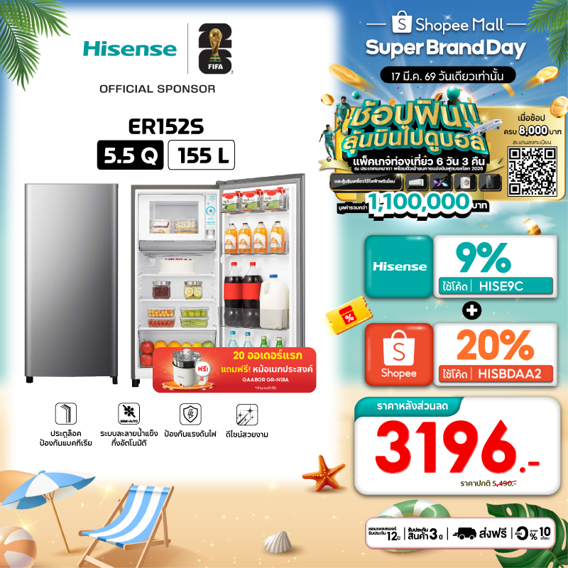 Hisense ตู้เย็น 1 ประตู ขนาด 5.5Q/ 155 ลิตร รุ่น ER152S