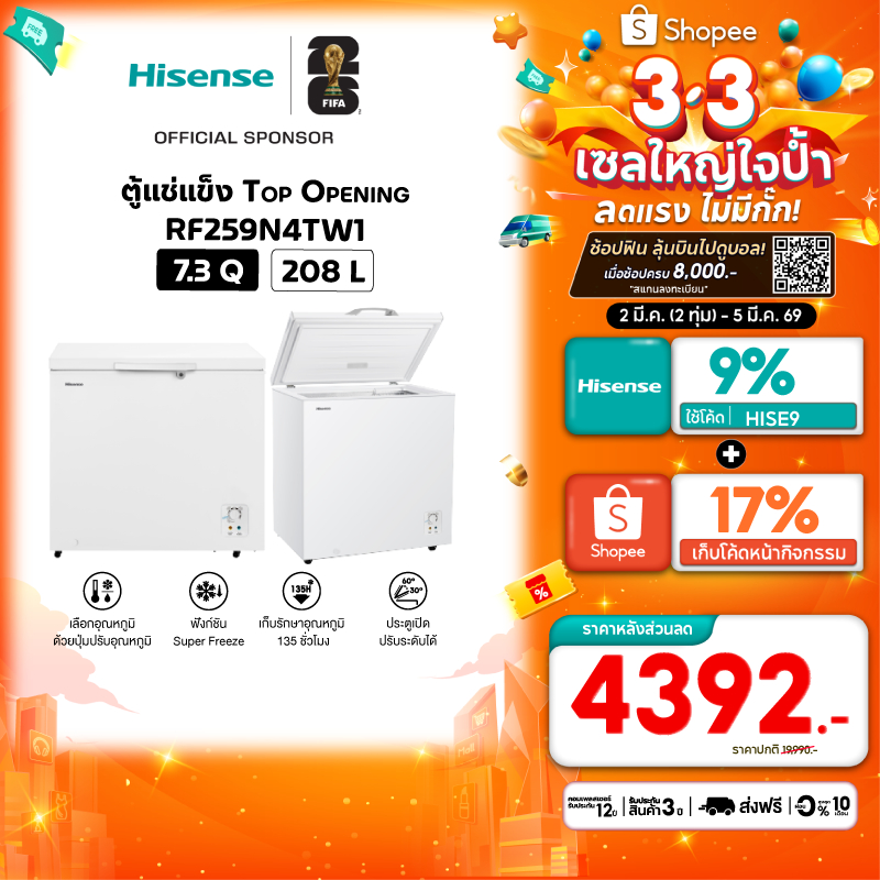 Hisense ตู้แช่แข็ง ขนาด 208 ลิตร Freezer รุ่น RF259N4TW1 สีขาว