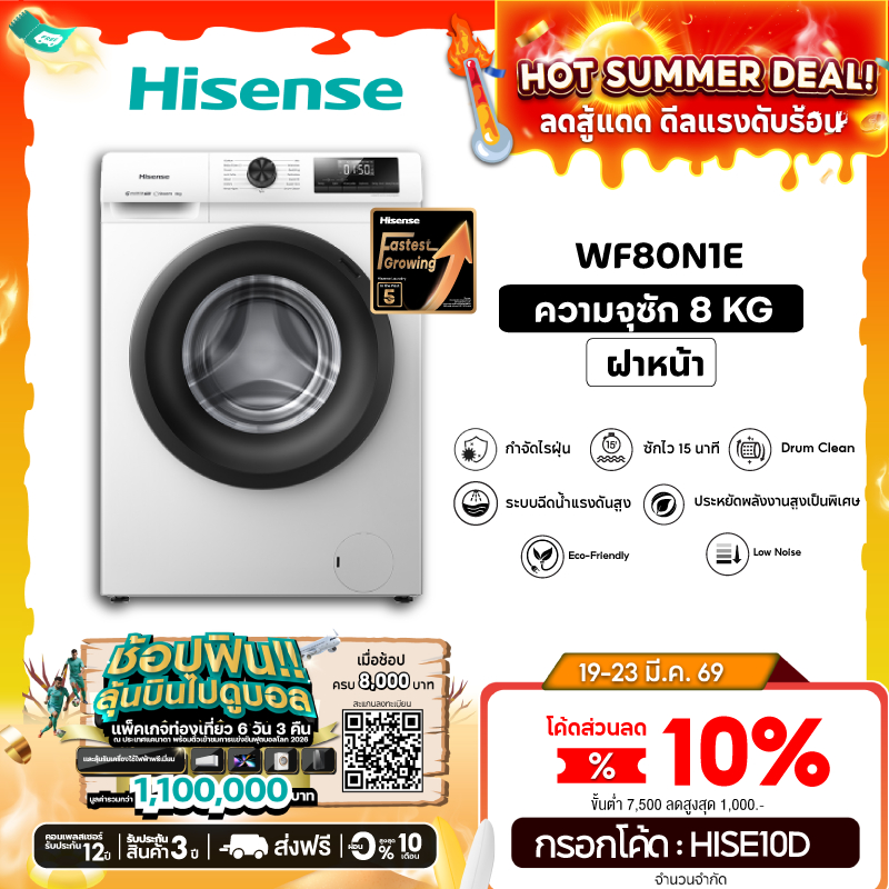 Hisense เครื่องซักผ้าฝาหน้า Inverter รุ่น WF80N1E ความจุ 8 กก. สีขาว