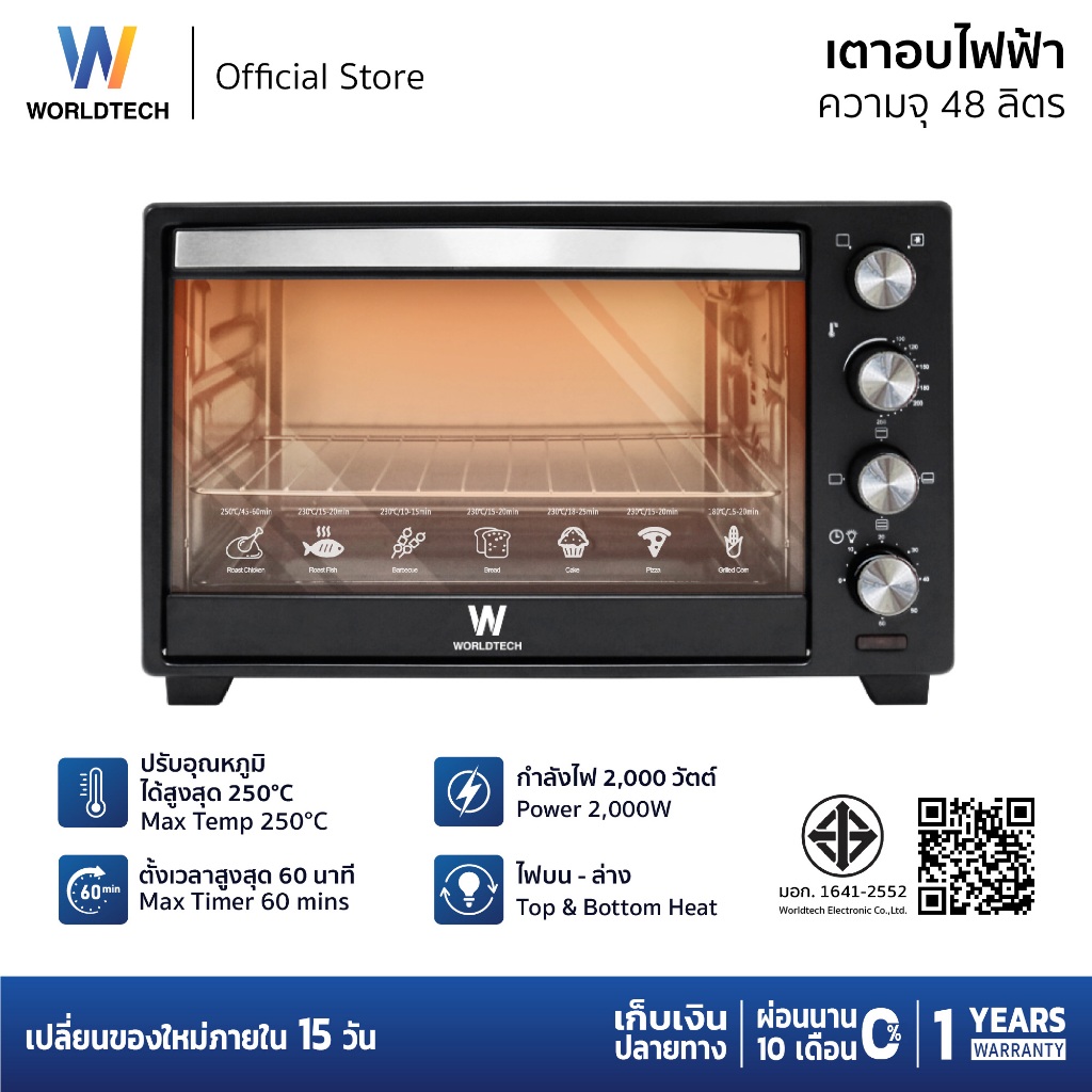 Worldtech เตาอบ ไฟฟ้า ขนาด 48 ลิตร แถม ถาดอบ ด้ามจับถาดและตะแกรง รุ่น WT-OV48L_BLK