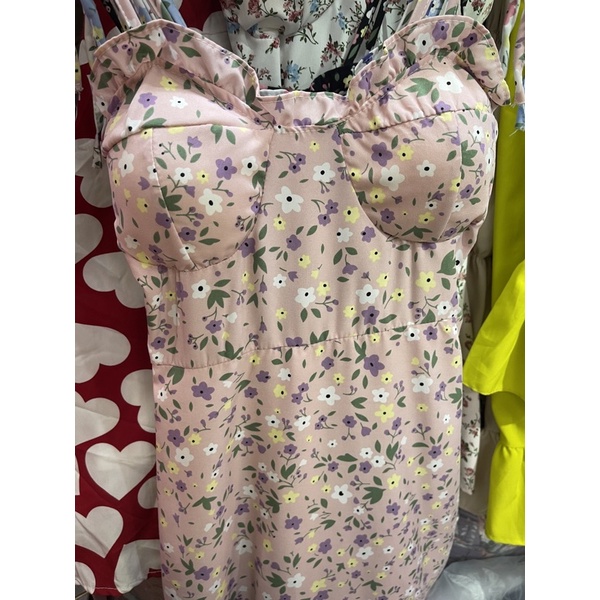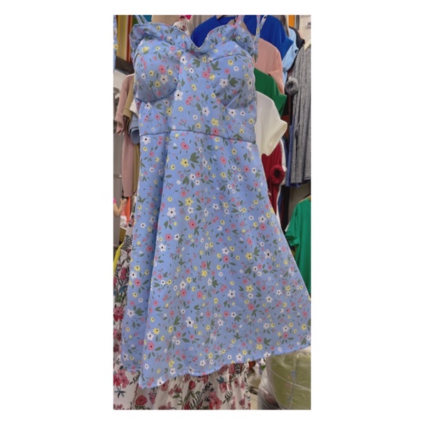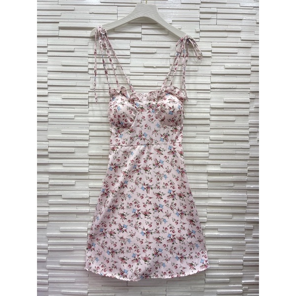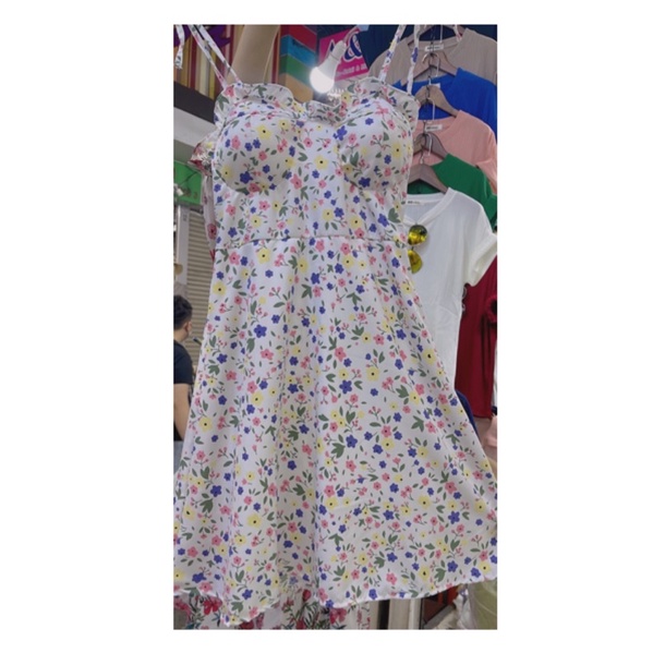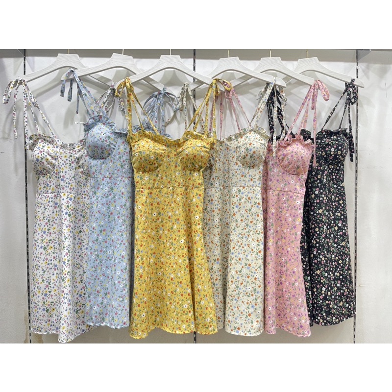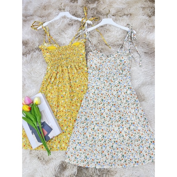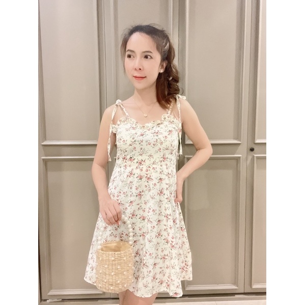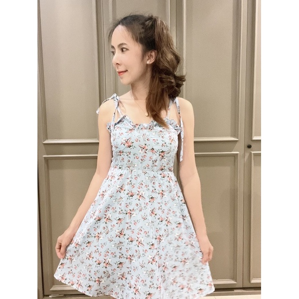 สด3175 เดรสสั้น สายเดี่ยวแม่อั้ม ลายดอก แต่งโบว์ผูกไหล่ มีสม็อคหลัง ระบายอก มีฟองน้ำน่ะค่ะ