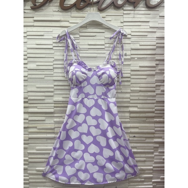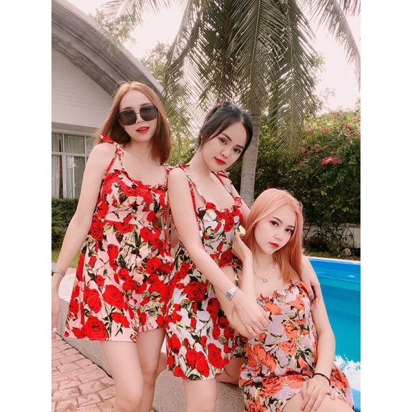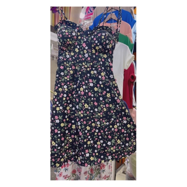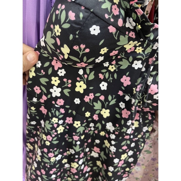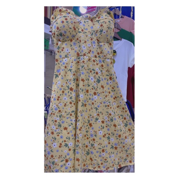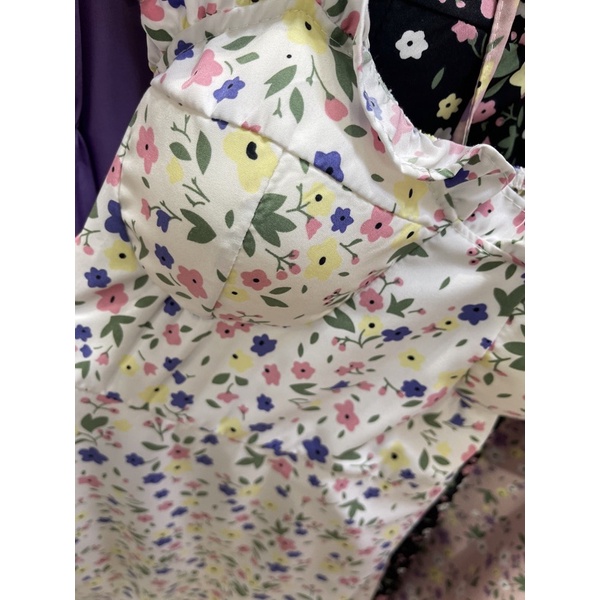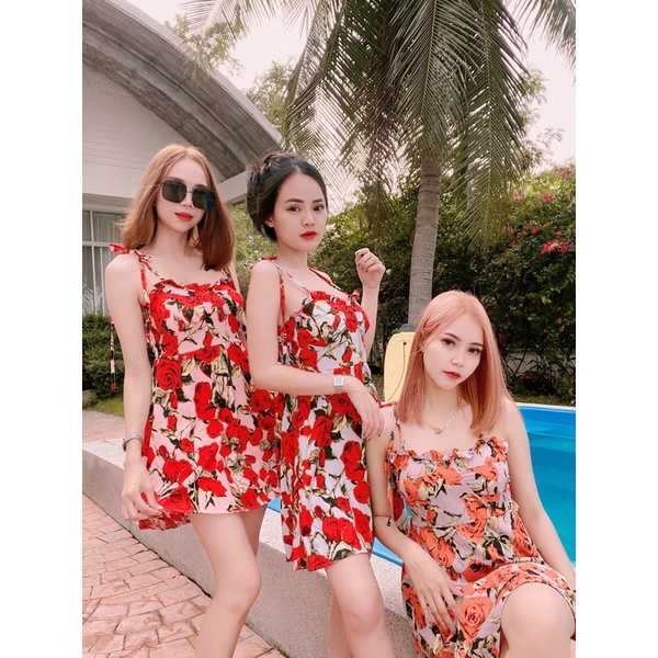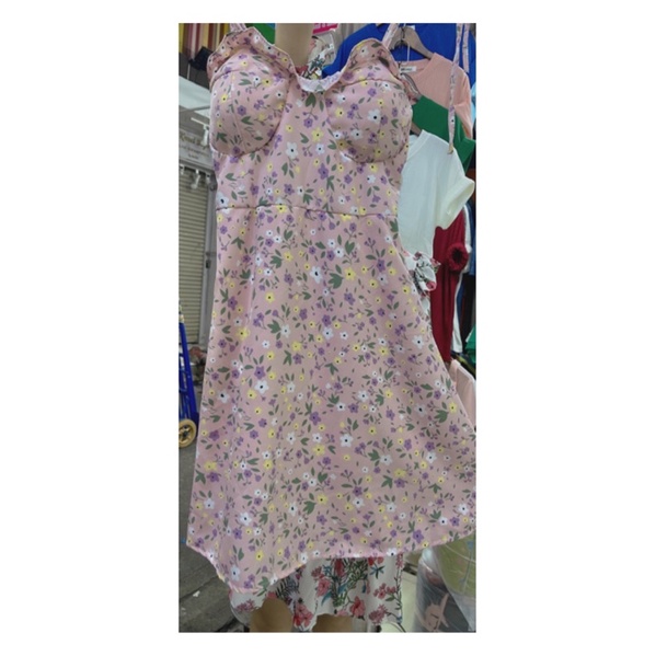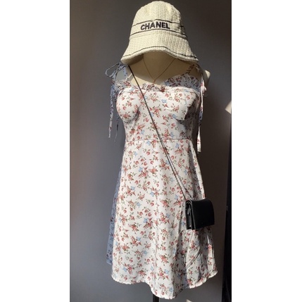 สด3175 เดรสสั้น สายเดี่ยวแม่อั้ม ลายดอก แต่งโบว์ผูกไหล่ มีสม็อคหลัง ระบายอก มีฟองน้ำน่ะค่ะ