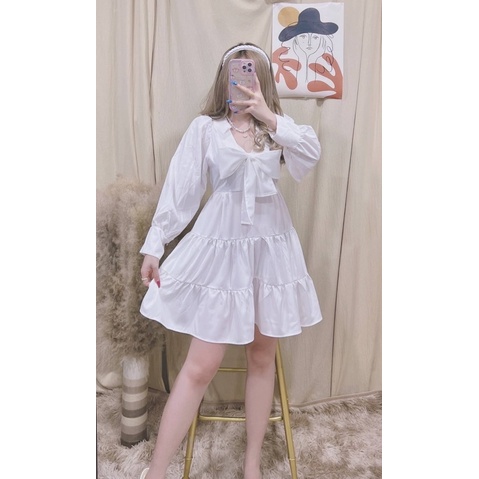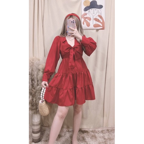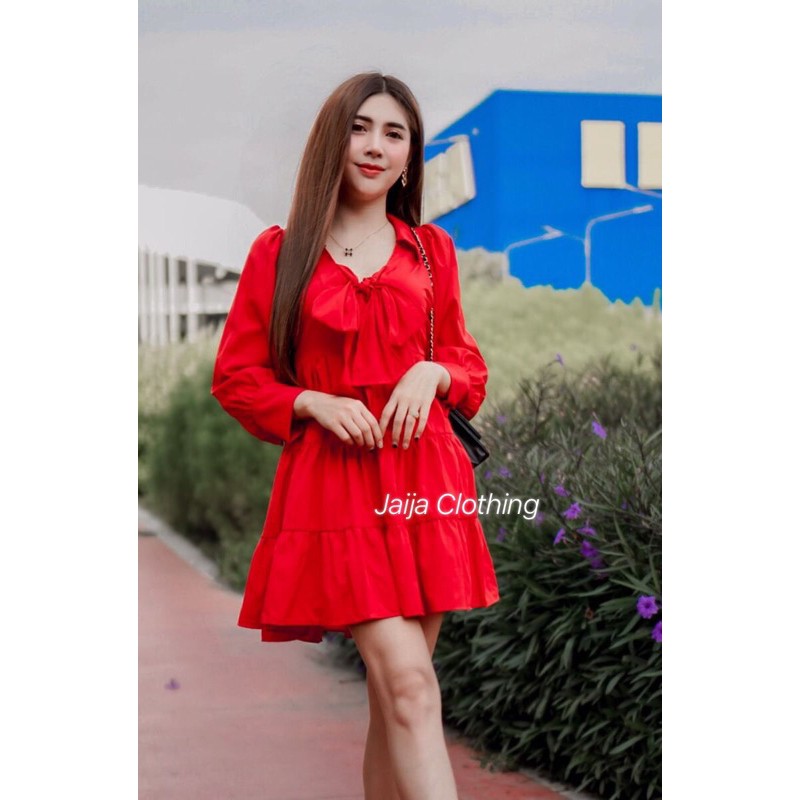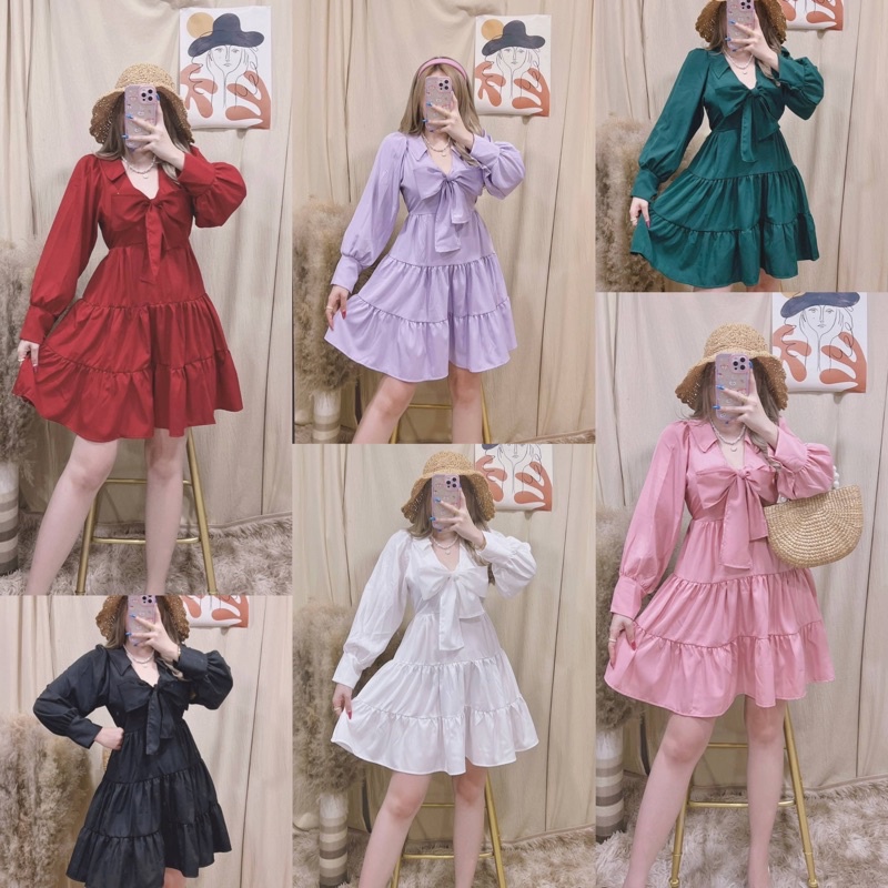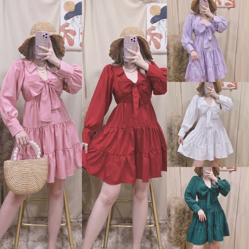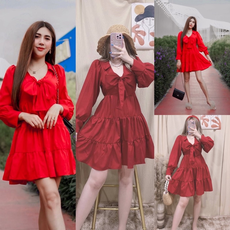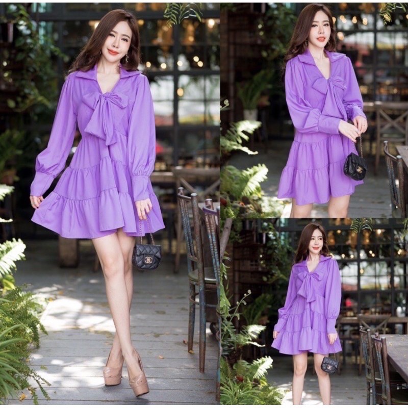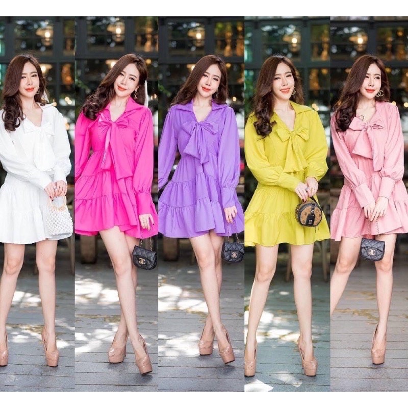 สพ0014 มินิเดรส ทรงคอวี คอปก แต่งโบว์ผูกหน้า แขนยาว ชายระบาย ผ้าไหมอิตาลี สุดฮิตคือต้องมีค่ะ งานสวยมากกกค่ะ