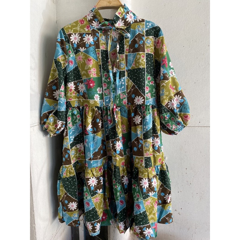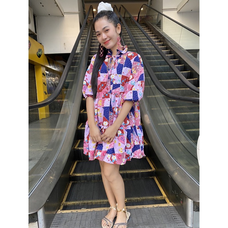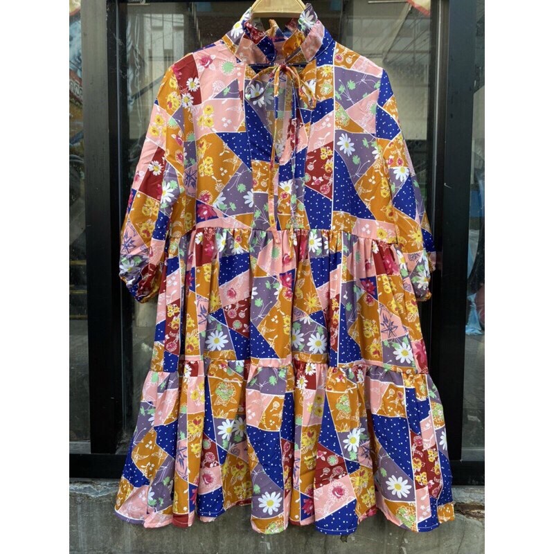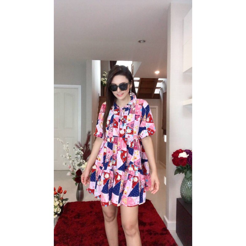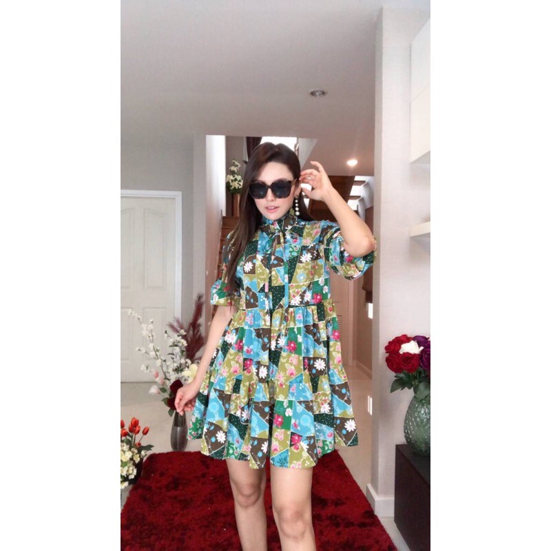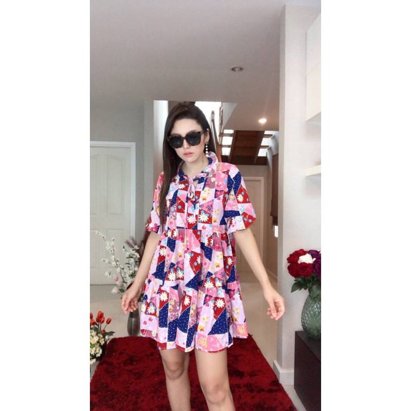 k.001 มินิเดรสสไตล์เกาหลีคอระบาย มีเชือกผูกโบว์ ลายสวยสดใสใส่สบายน่ารักมาก