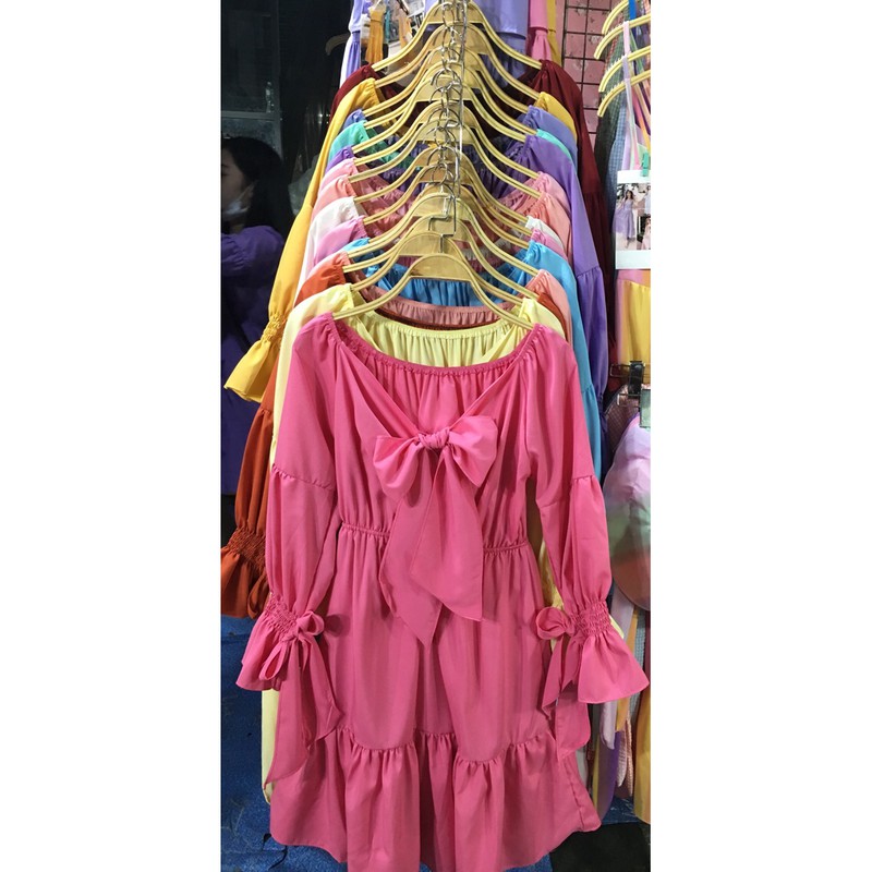 ป.2101 มินิเดรส เดรสทะเล ทรงคอวี แต่งโบว์ผูกหน้า มีสม็อคอกรอบตัว แขนยาว ปลายแขนดึงยางสม็อคมีเชือกผูกโบว์ ชายระบาย สุดฮิต