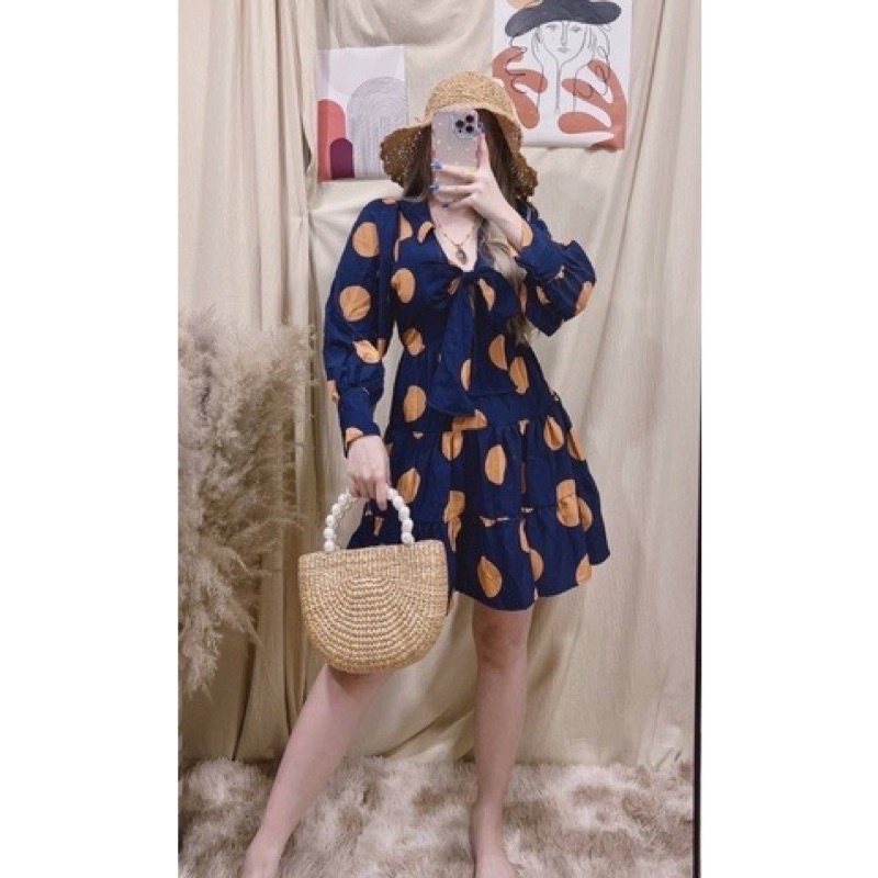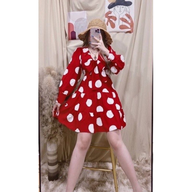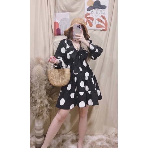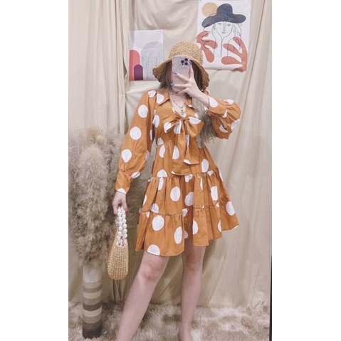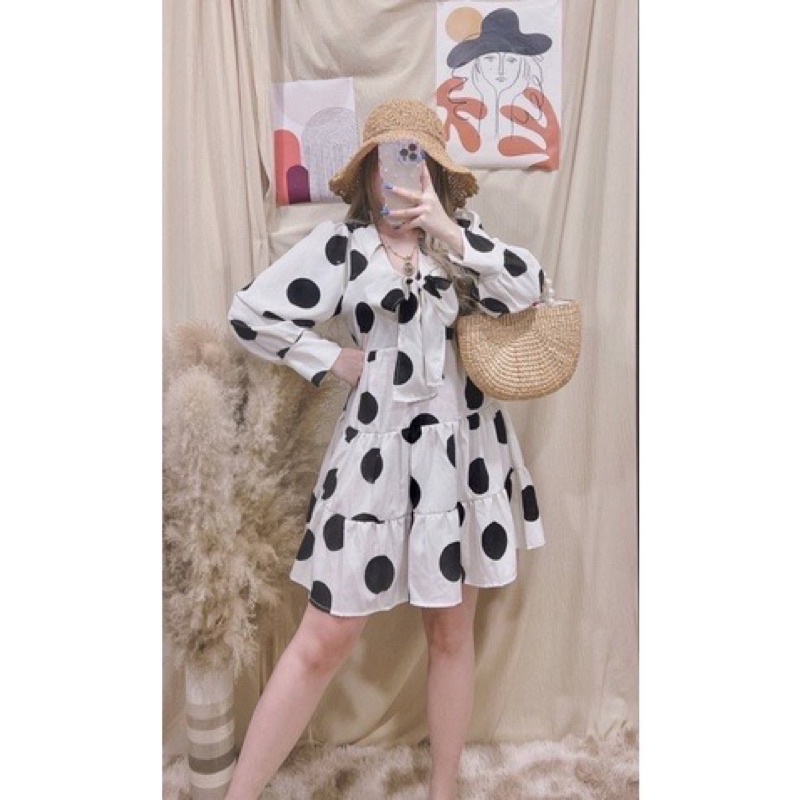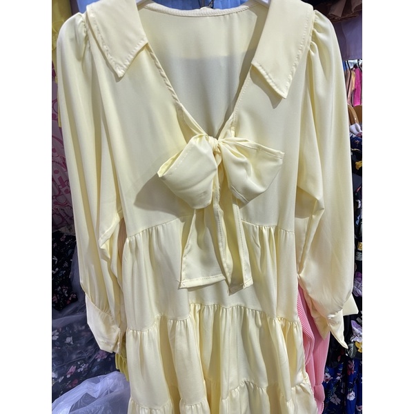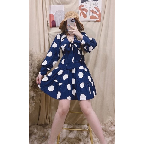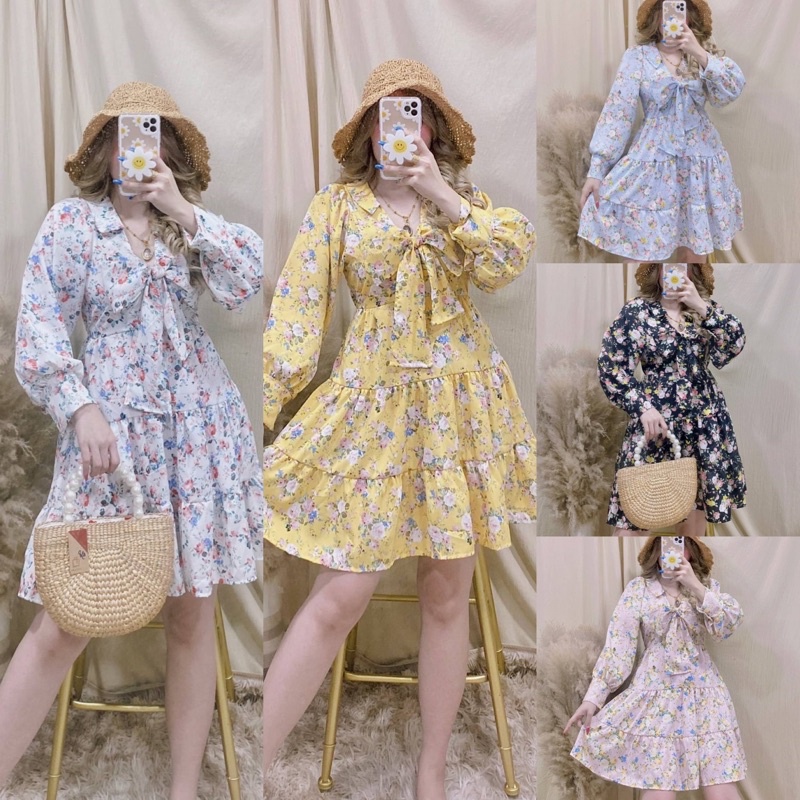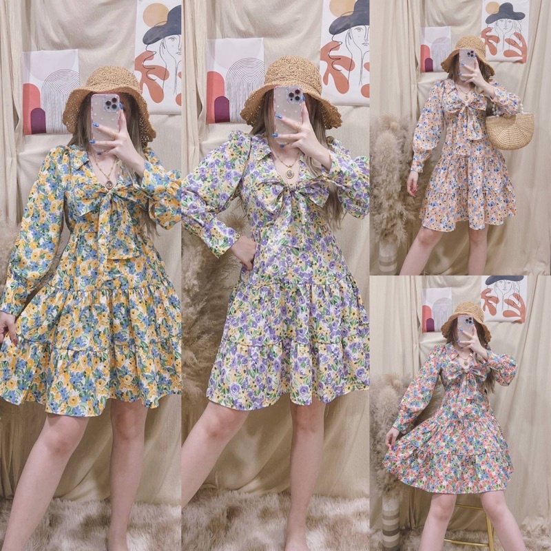บจ8130 โบว์หน้าลายดอกลายจุด ทรงมินิเดรส ตรงคอวี มีคอปก แต่งโบว์ผูกหน้า ทรงแขนมีกระดุมปลายแขน ด้านหลังแต่งยางสม็อค