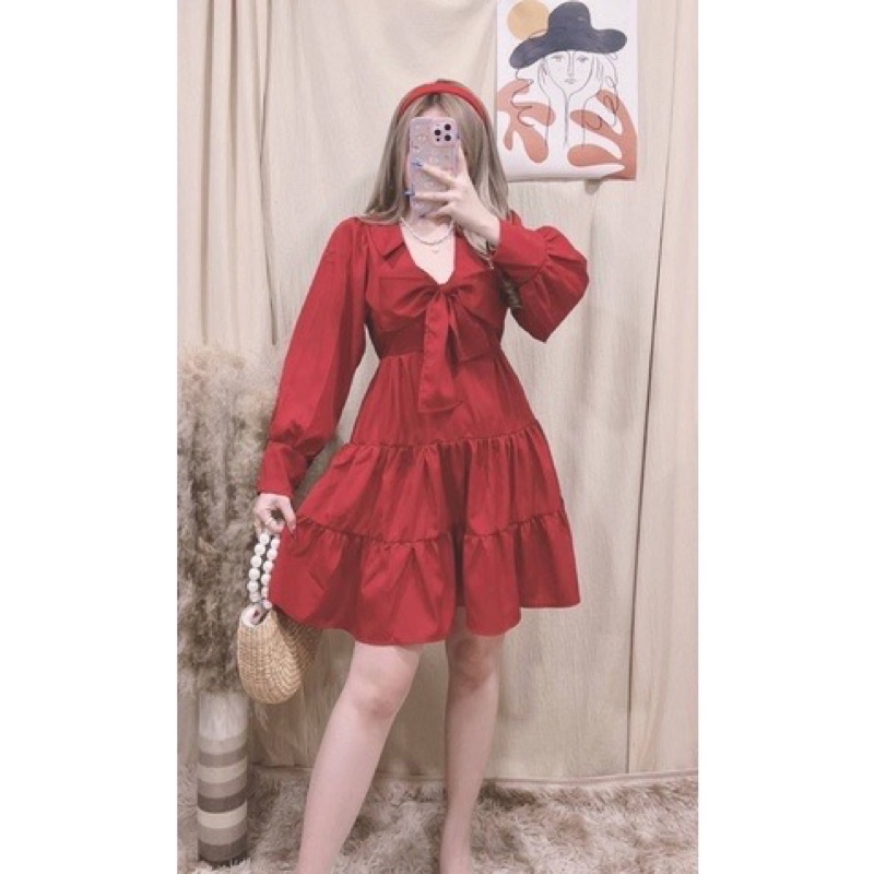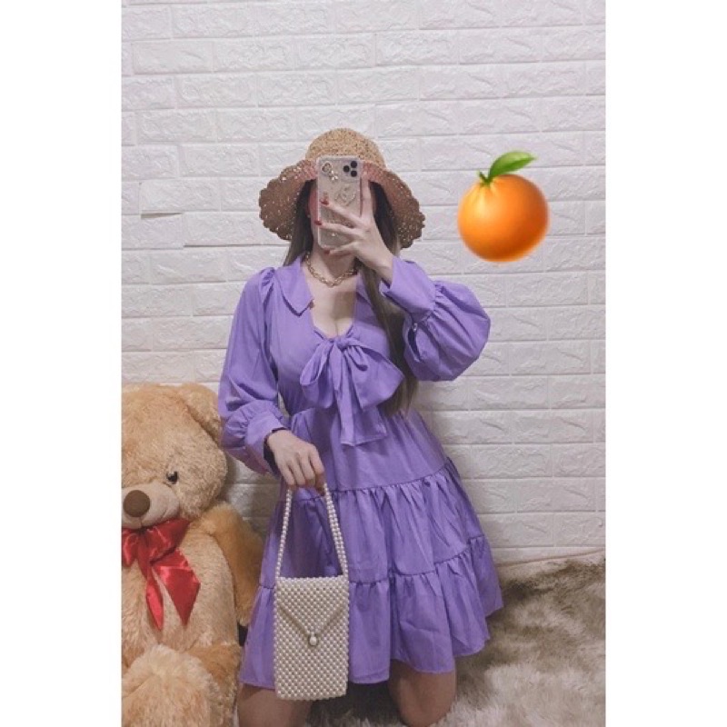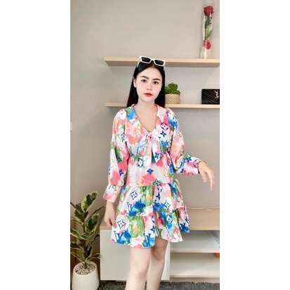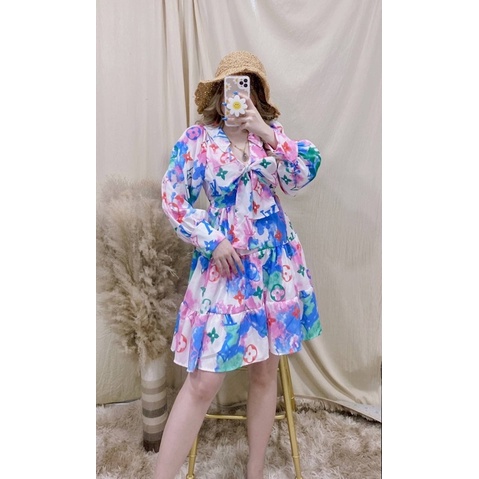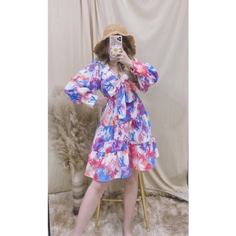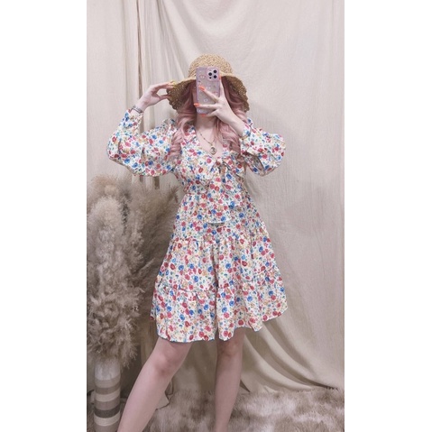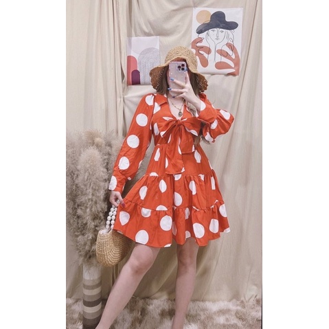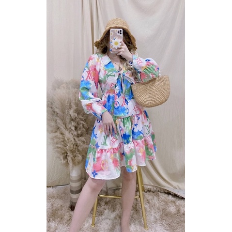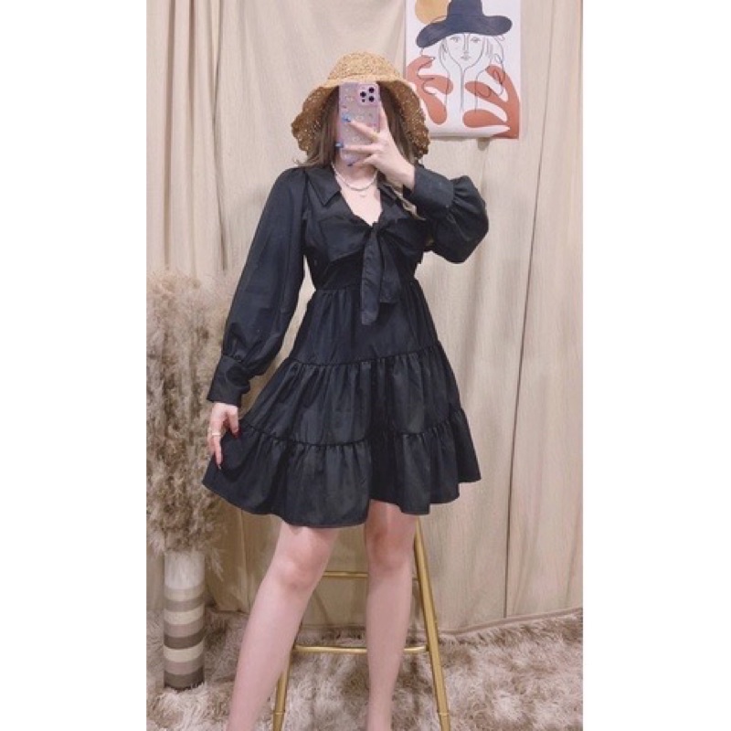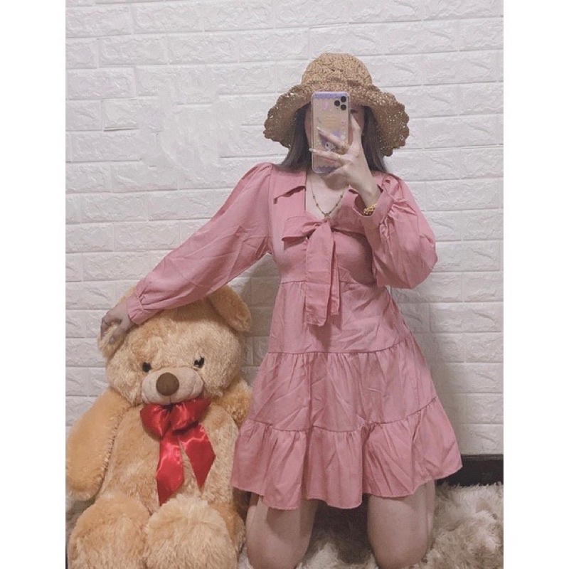 บจ8130 โบว์หน้าลายดอกลายจุด ทรงมินิเดรส ตรงคอวี มีคอปก แต่งโบว์ผูกหน้า ทรงแขนมีกระดุมปลายแขน ด้านหลังแต่งยางสม็อค
