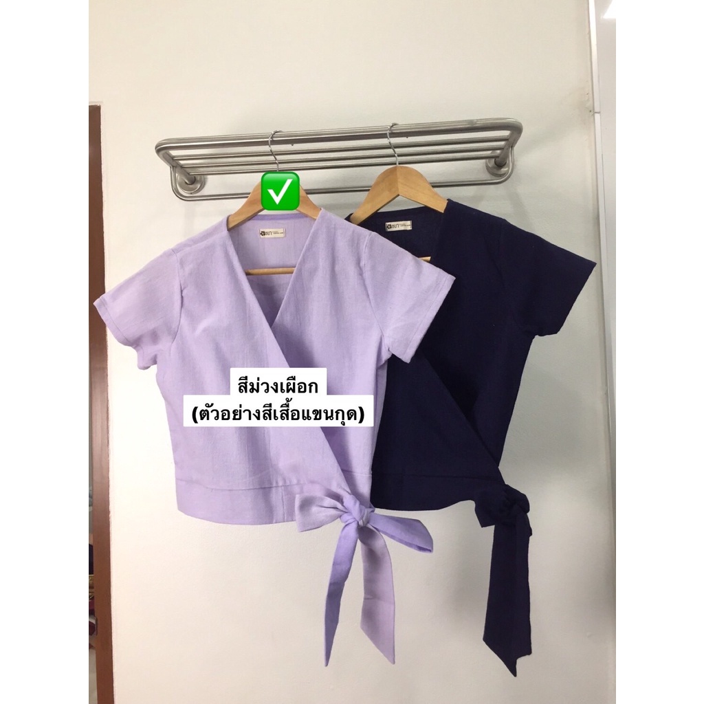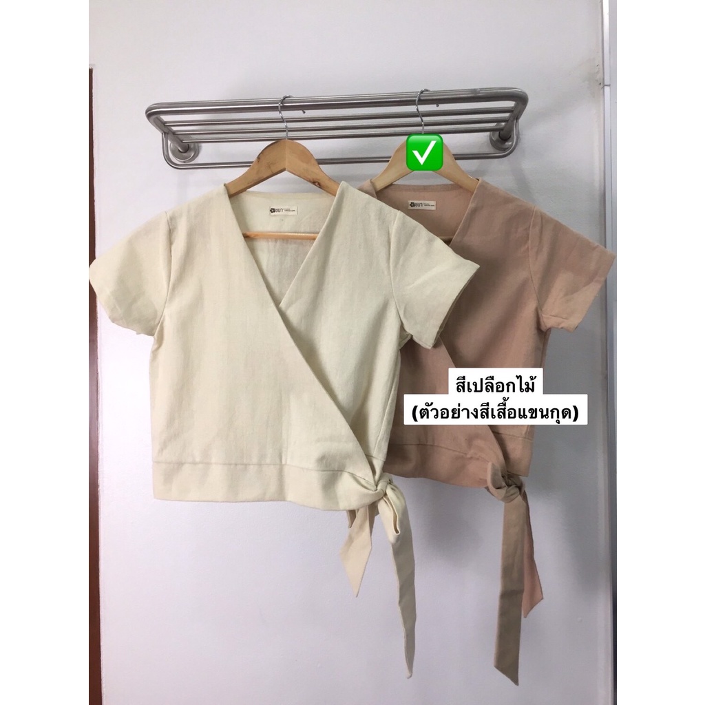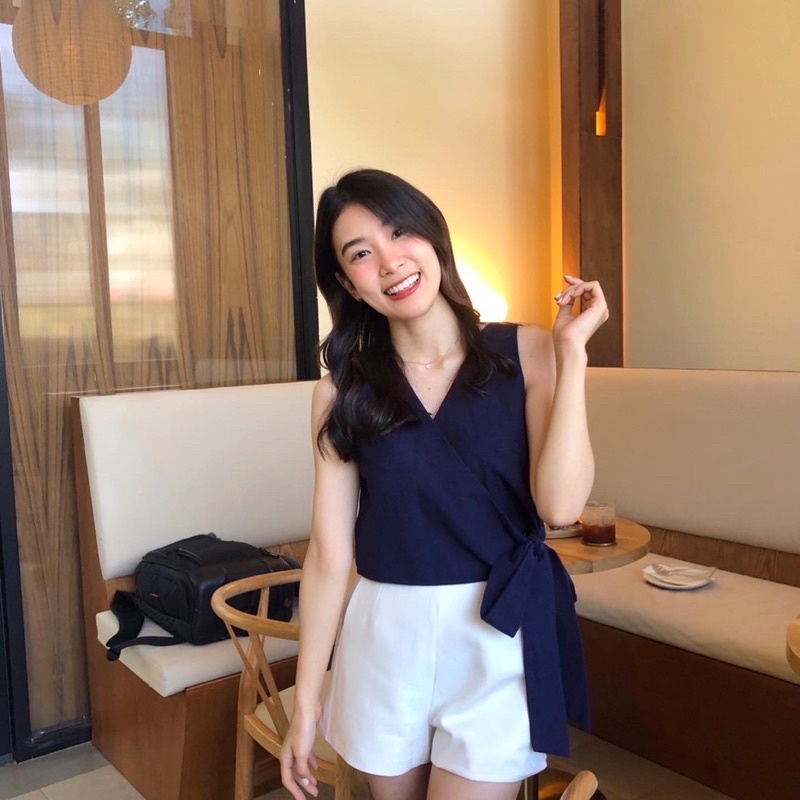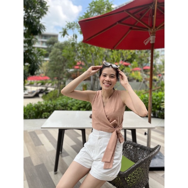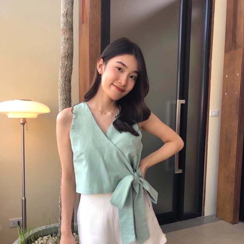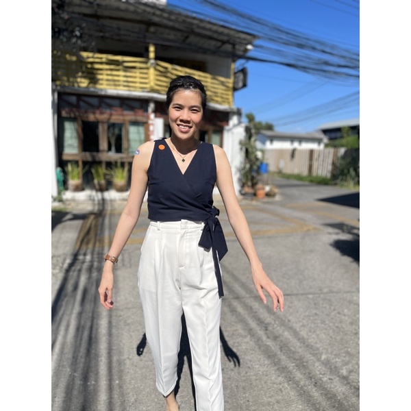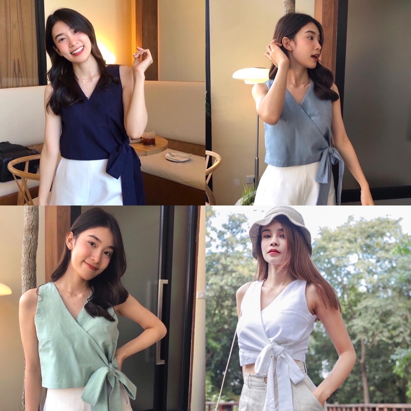 เสื้อ WRAP TOP แขนกุด,ผูกเอว,คอวี,ผ้าฝ้าย,ผ้าฝ้ายชบา