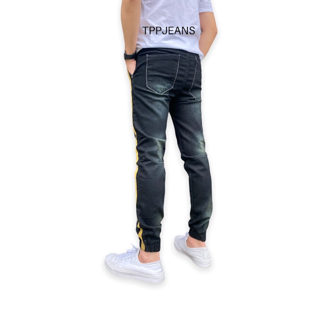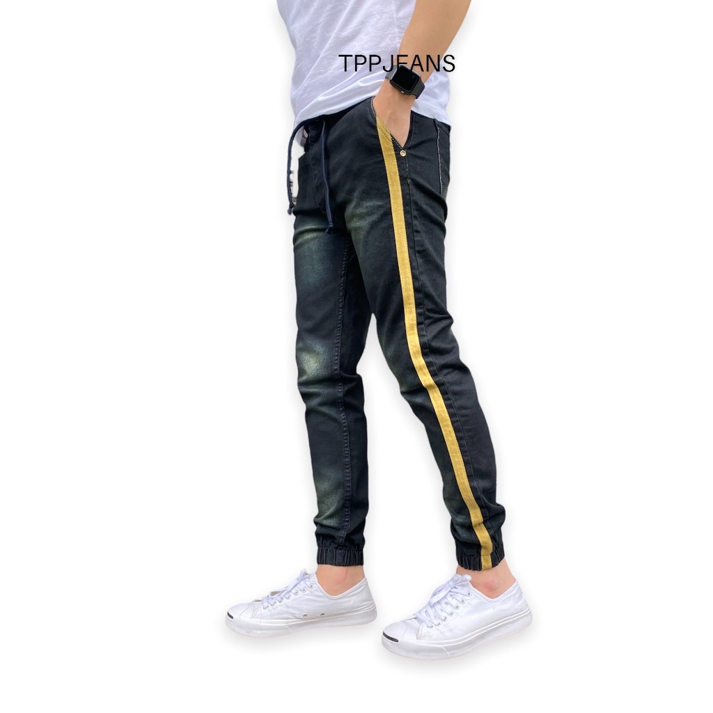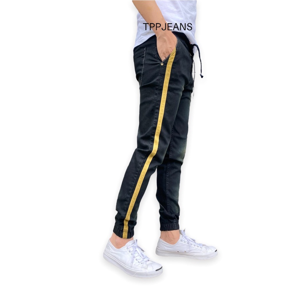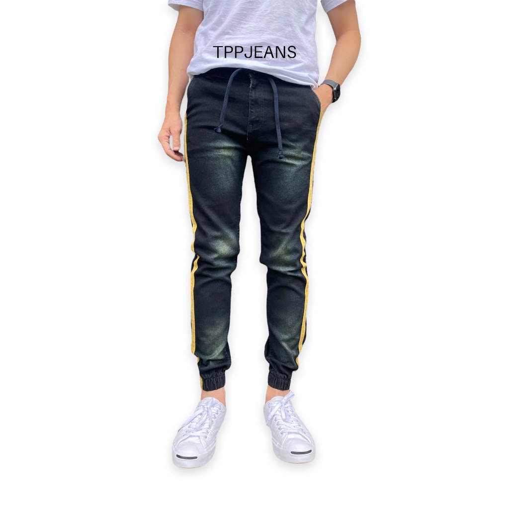 JEANSEXPRESS Jogger Jeans กางเกงจ๊อกเกอร์ขาจั้มเอวยางมีเชือกเป้าซิป ผ้ายืด สีดำสนิม แถบข้าง งานตัดเย็บอย่างดี Size 28-36