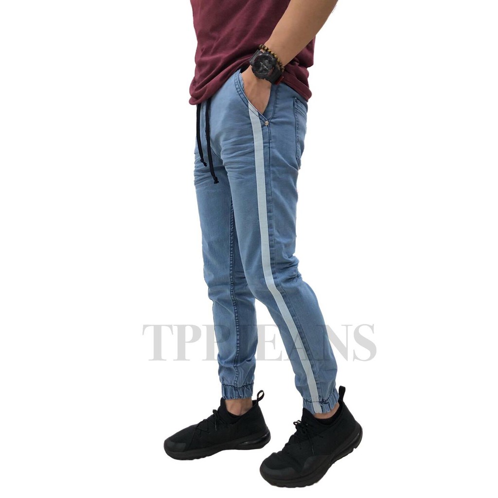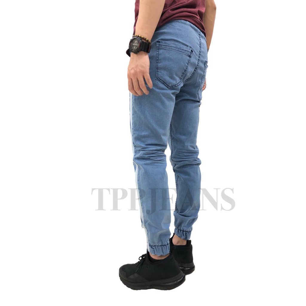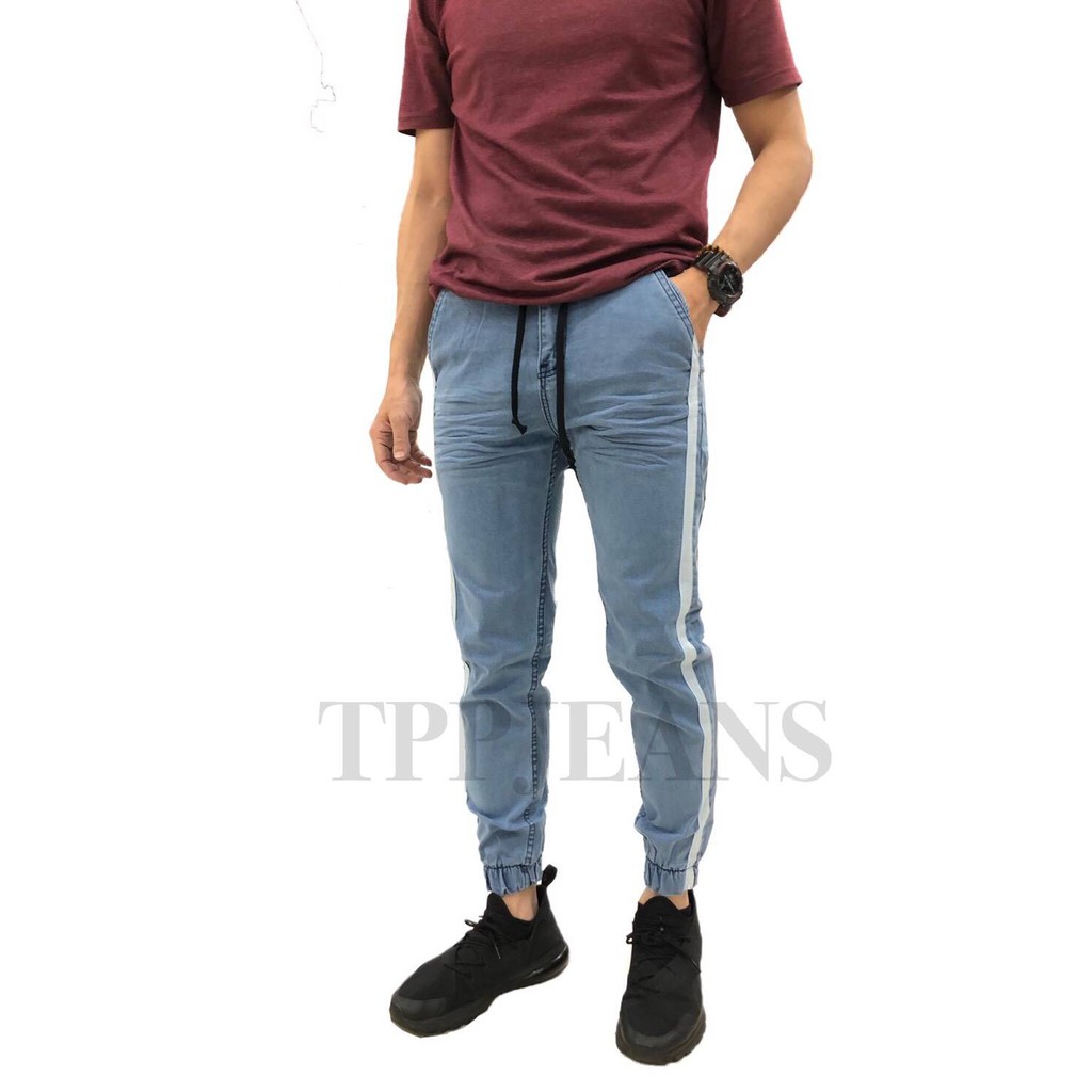 JOGGER Jeans กางเกงขาจั้ม ผ้ายีนส์ยืด เป้าซิป สีบลูฟอกซีดเดินแถบขาว Size 26-36