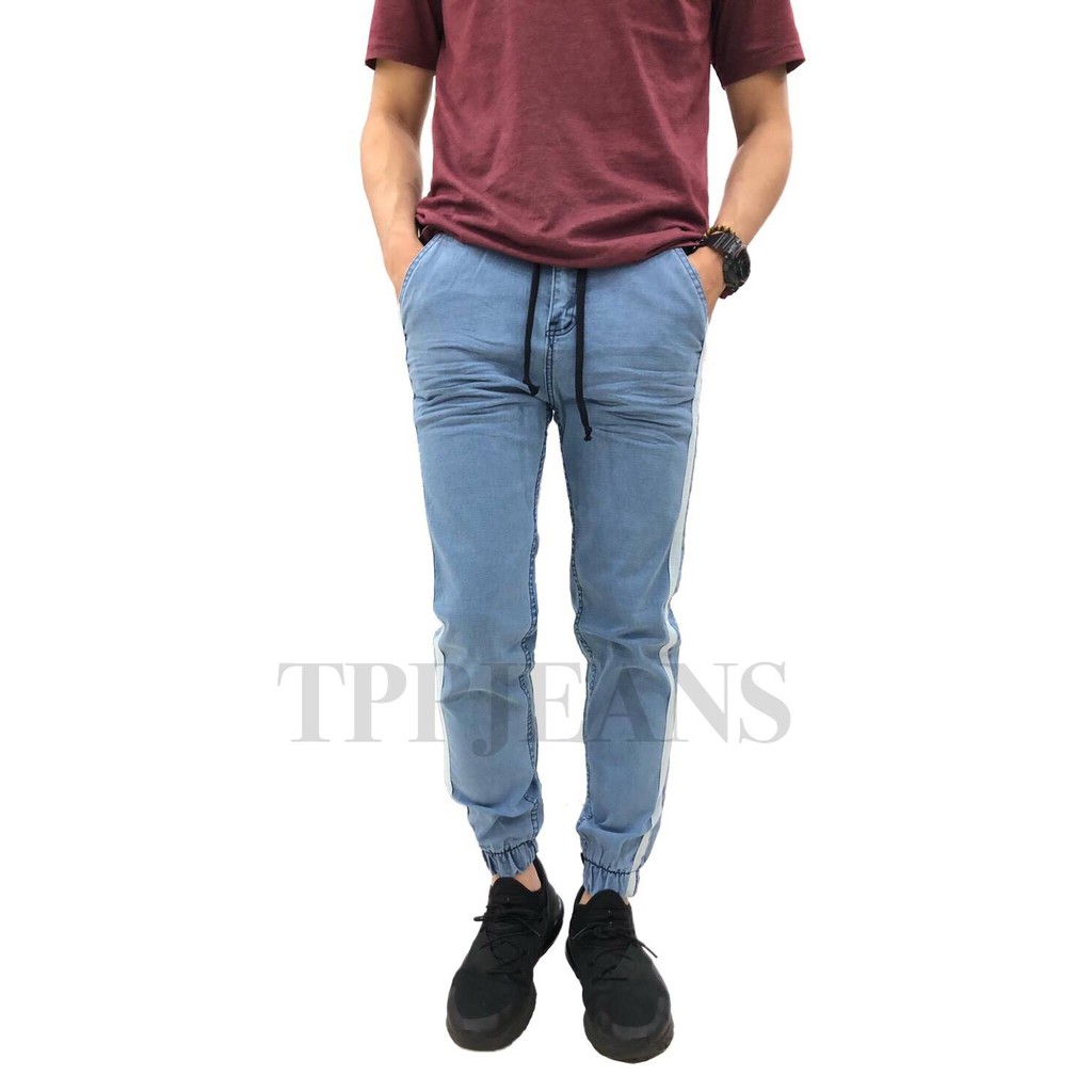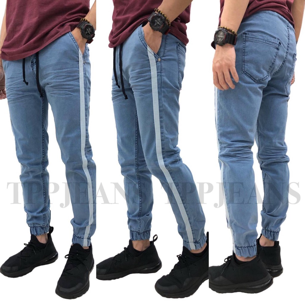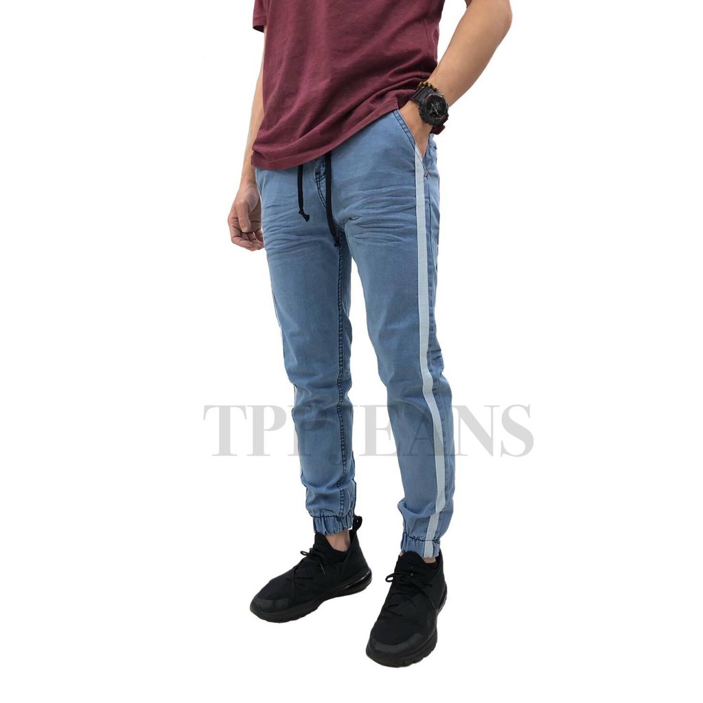 JOGGER Jeans กางเกงขาจั้ม ผ้ายีนส์ยืด เป้าซิป สีบลูฟอกซีดเดินแถบขาว Size 26-36