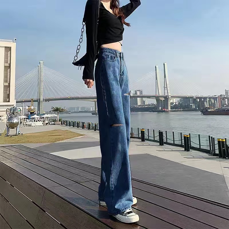 💥มีไซส์ S-2XL💥กางเกงยีนส์ เอวสูง ขาบานแบบขาดๆ สไตล์เกาหลี กางเกงยีนส์ขายาว สวยๆเก๋ๆ#522