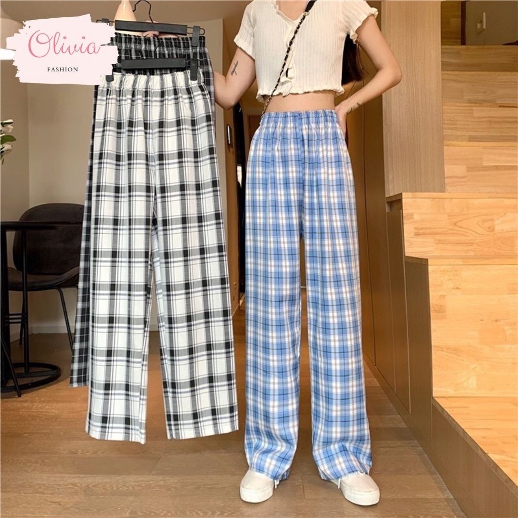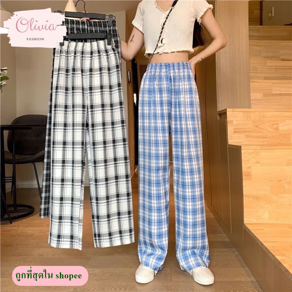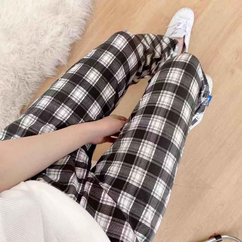 🍓ถูกที่สุด30สี🍓 กางเกงลายสก็อต สไตล์เกาหลี ผู้หญิงเอวสูงยางยืด ทรงกระบอก #355